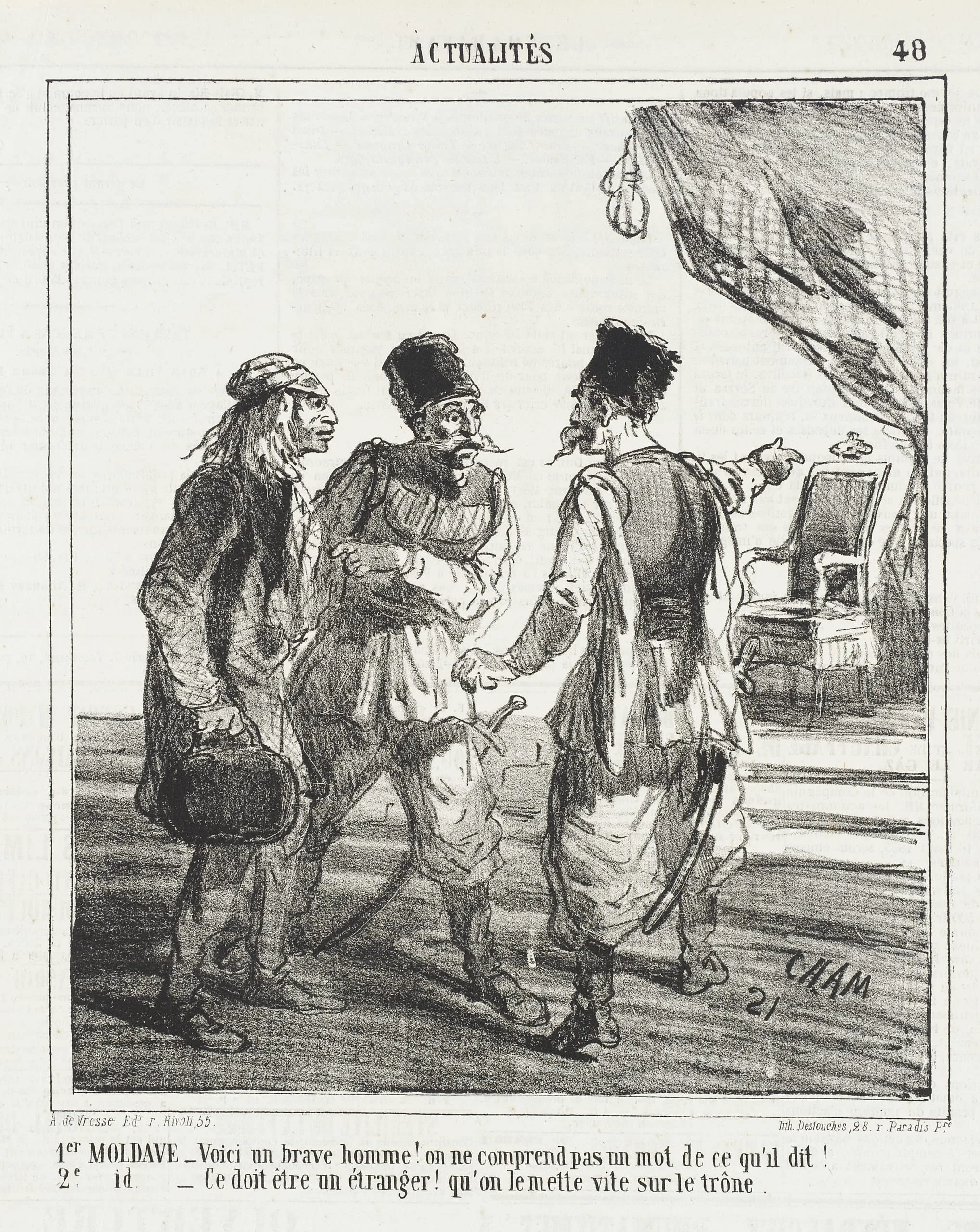 - 1er Moldave -Voici un brave homme! On ne comprend pas un mot de ce qu'il dit! 2e Moldave -Ce doit être un étranger! Qu'on le mette vite sur le trône.