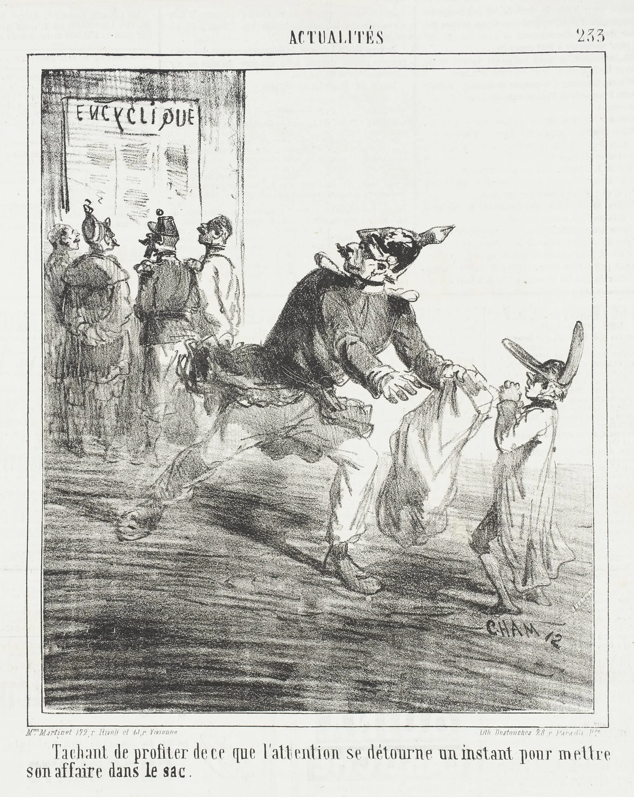- Tachant de profiter de ce que l'attention se detourne un instant pour mettre son affaire dans le sac