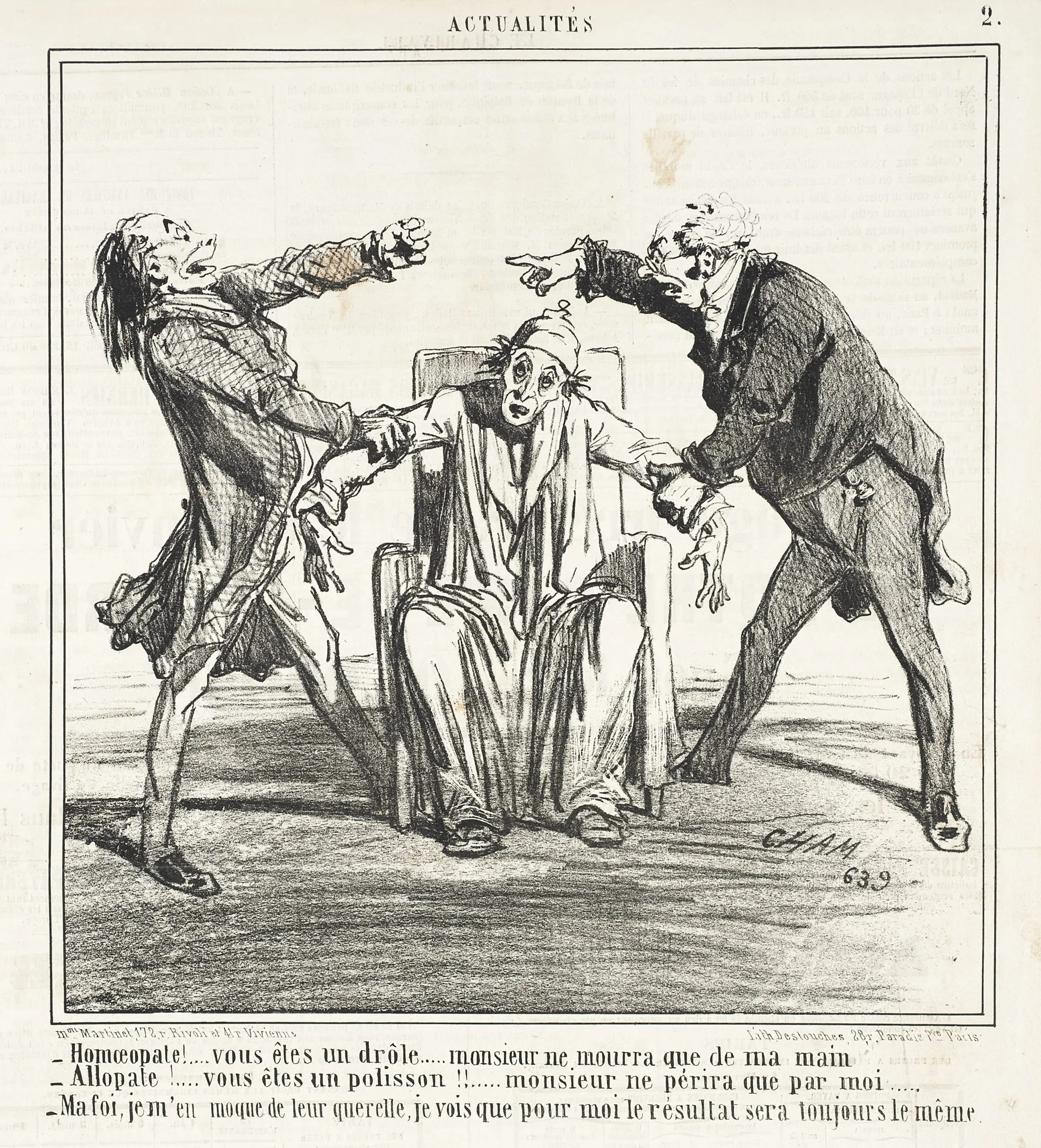 - Homeopate!...vous êtes un drôle...Monsieur ne mourra que de ma mains. -Allopate!...vous êtes un polisson!! Monsieur ne perira que par moi. -Ma foi je m'en moque de leurs querelles, je vois que pour moi le résultat sera toujours le même.