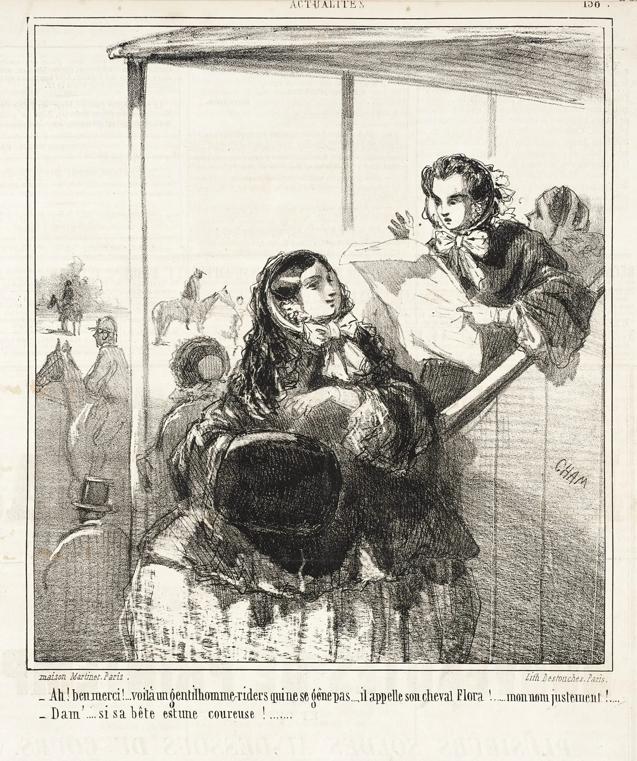 - Ah! Bien merci! Voilà un gentilhomme -riders qui ne se gêne pas...il appelle son cheval Flora! Mon nom justement! Dam' si sa bête est une coureuse!