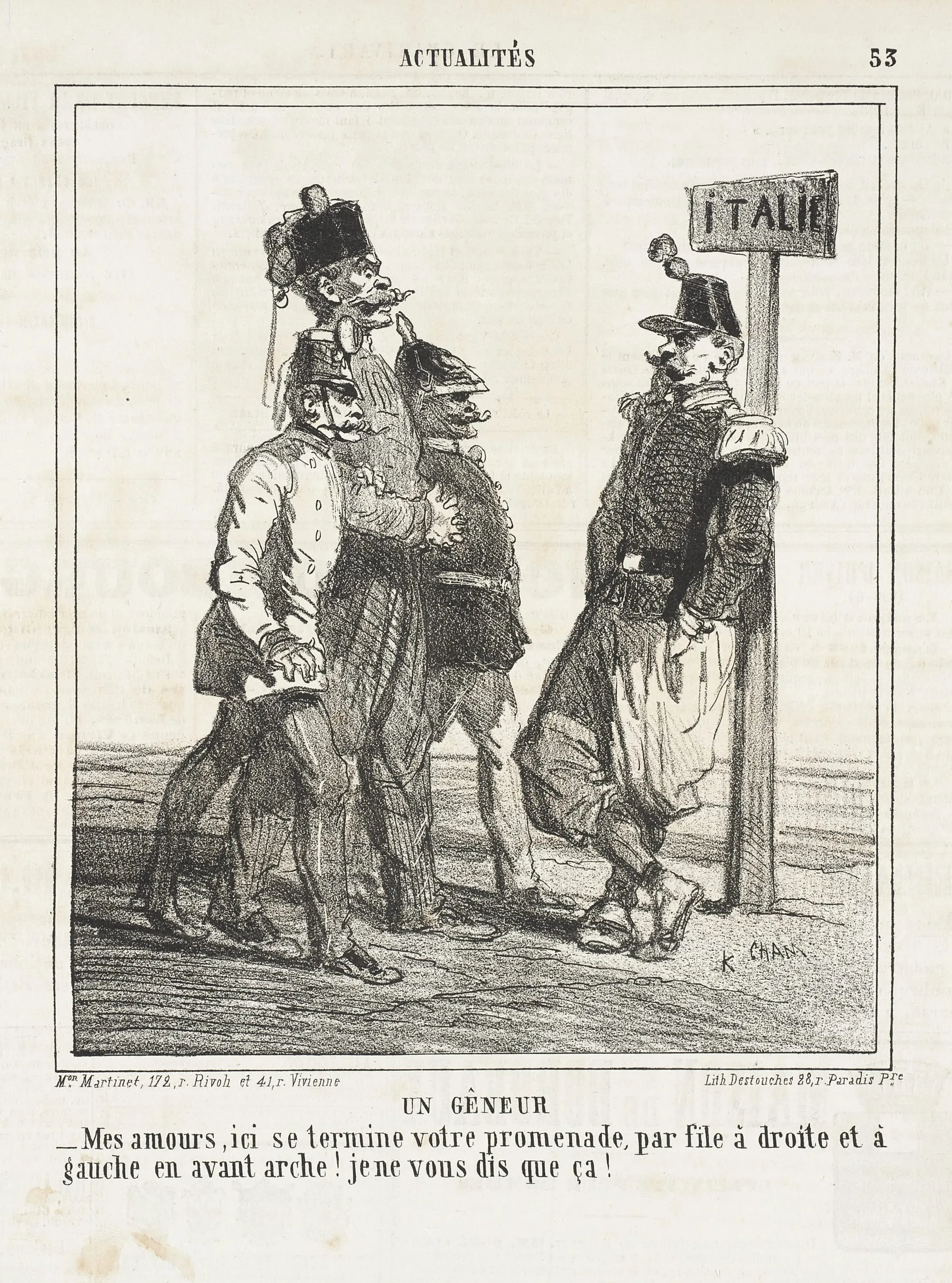 - Un gêneur: Mes amours, ici se termine votre promenade, pas file à droite et a gauche en avant [m]arche! Je ne vous dis que ça!