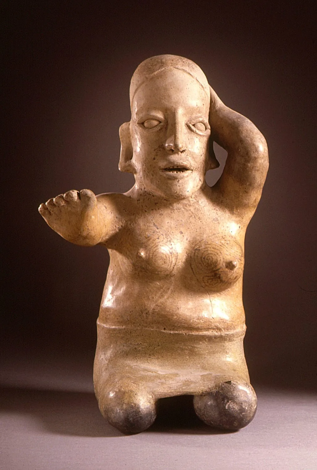 Ceramic sculpture of a seated female figure with raised arm and open mouth, tan and dark gray clay with incised circular decoration on the chest