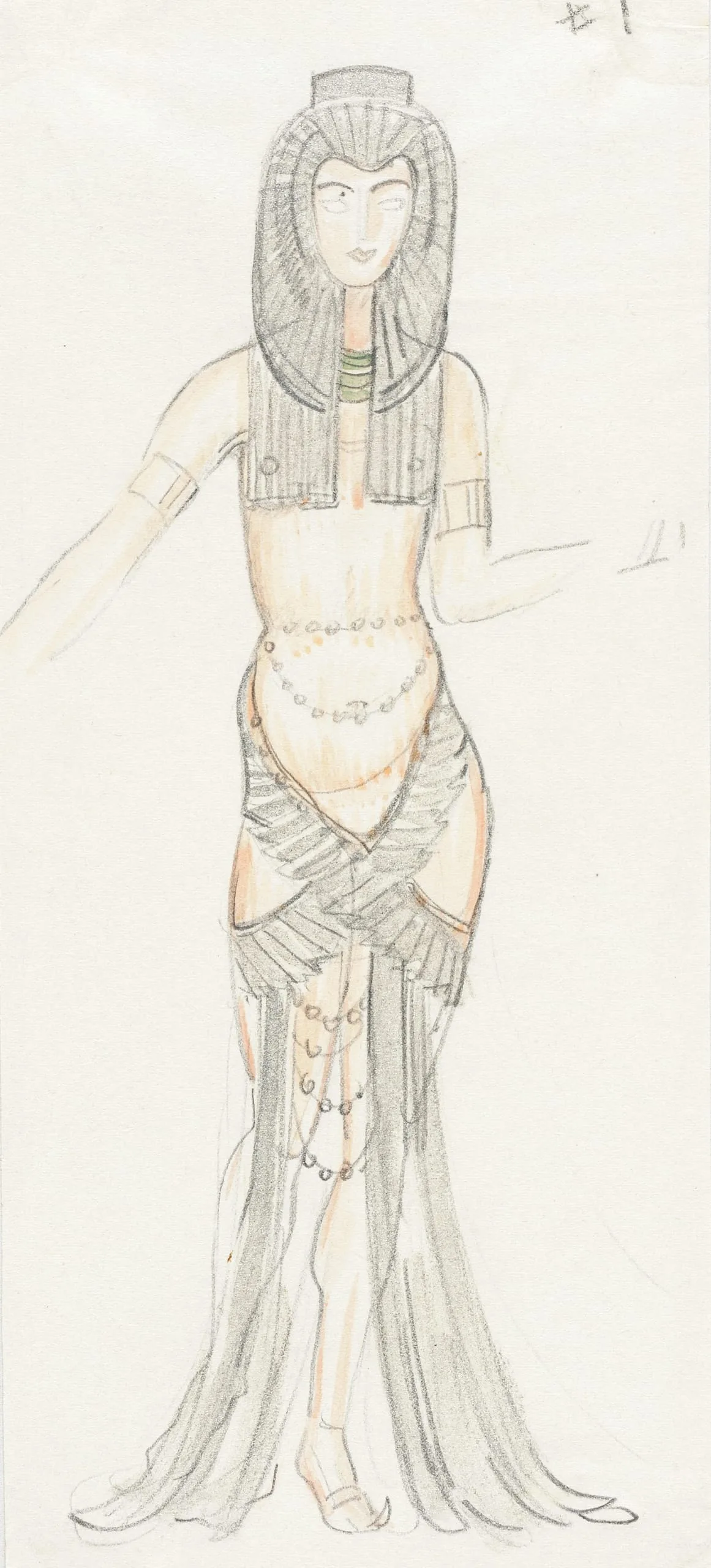 Pencil and colored pencil drawing on cream paper, full-length figure of a woman in an ancient Egyptian-inspired costume with a striped wig, bare midriff, pleated skirt, and beaded hip chains