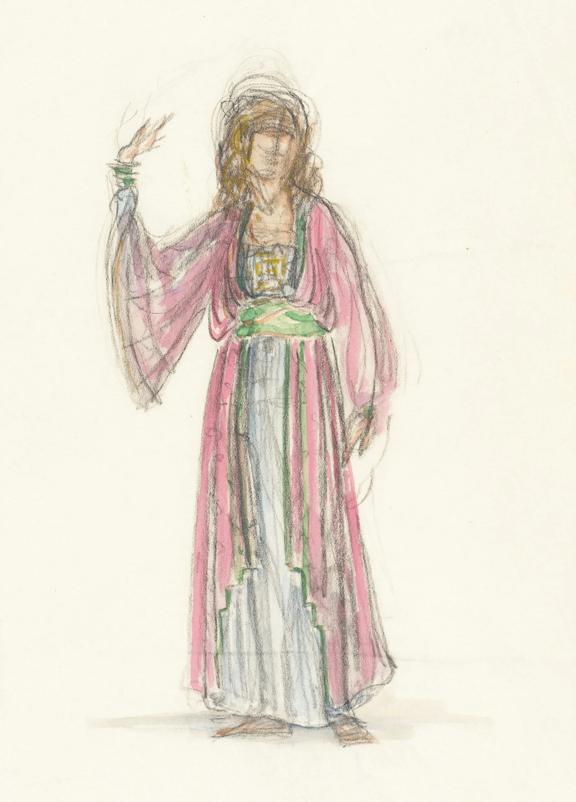 Full-length costume study drawing in colored pencil on cream paper, standing female figure in rose-pink robes, green sash, and striped skirt, holding a small torch aloft