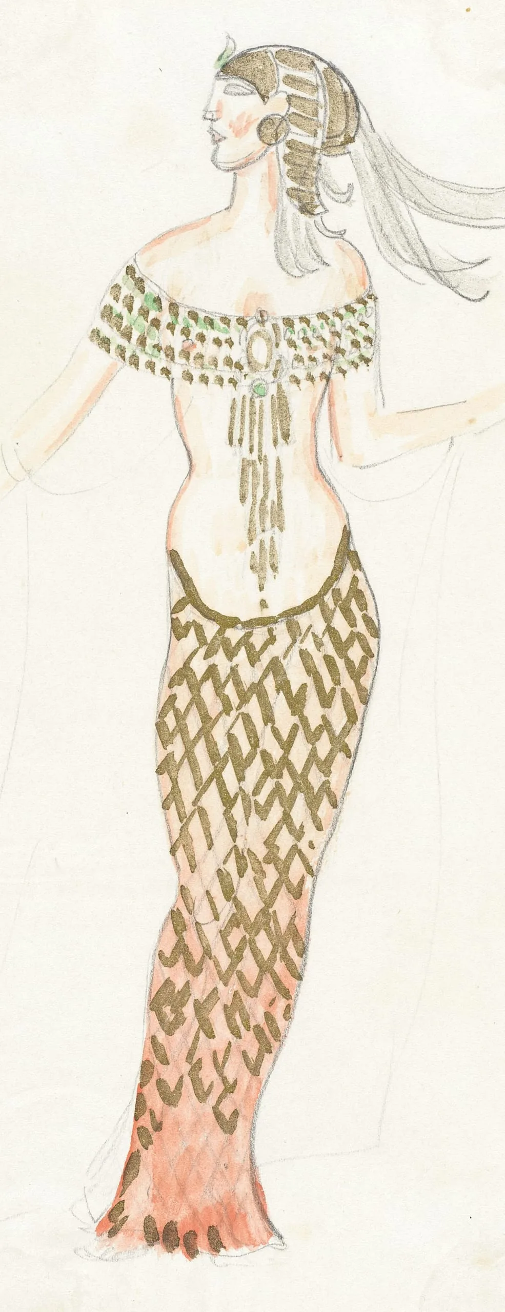 Pencil and watercolor costume drawing, full-length figure seen from behind with head in profile, wearing a beaded off-shoulder collar and geometric-patterned skirt in olive, tan, and coral