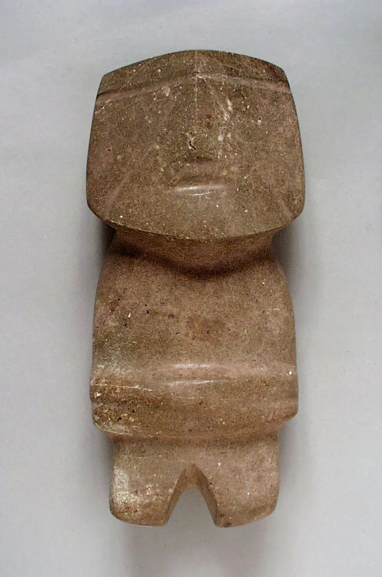 Small stone sculpture of a highly stylized standing human figure with an oversized geometric head, minimal carved facial detail, and blocky legs