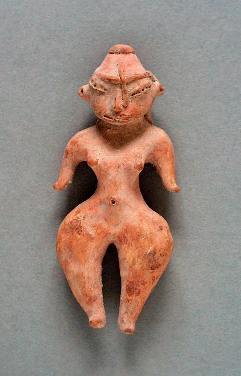 Small hand-modeled terra-cotta figurine of a seated nude figure with wide hips, stubby limbs, and an incised face, viewed straight on against a gray background