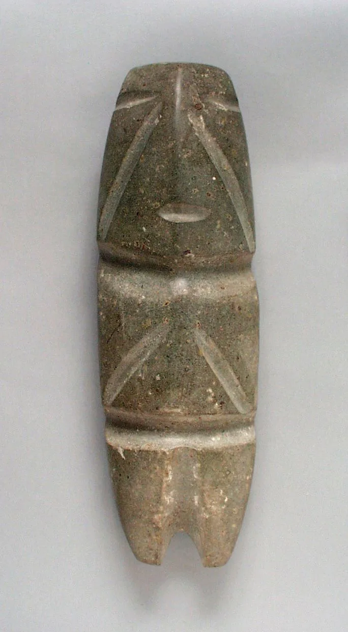 Small carved stone sculpture of an abstracted human figure in olive gray-green stone, with incised geometric patterns and a forked base