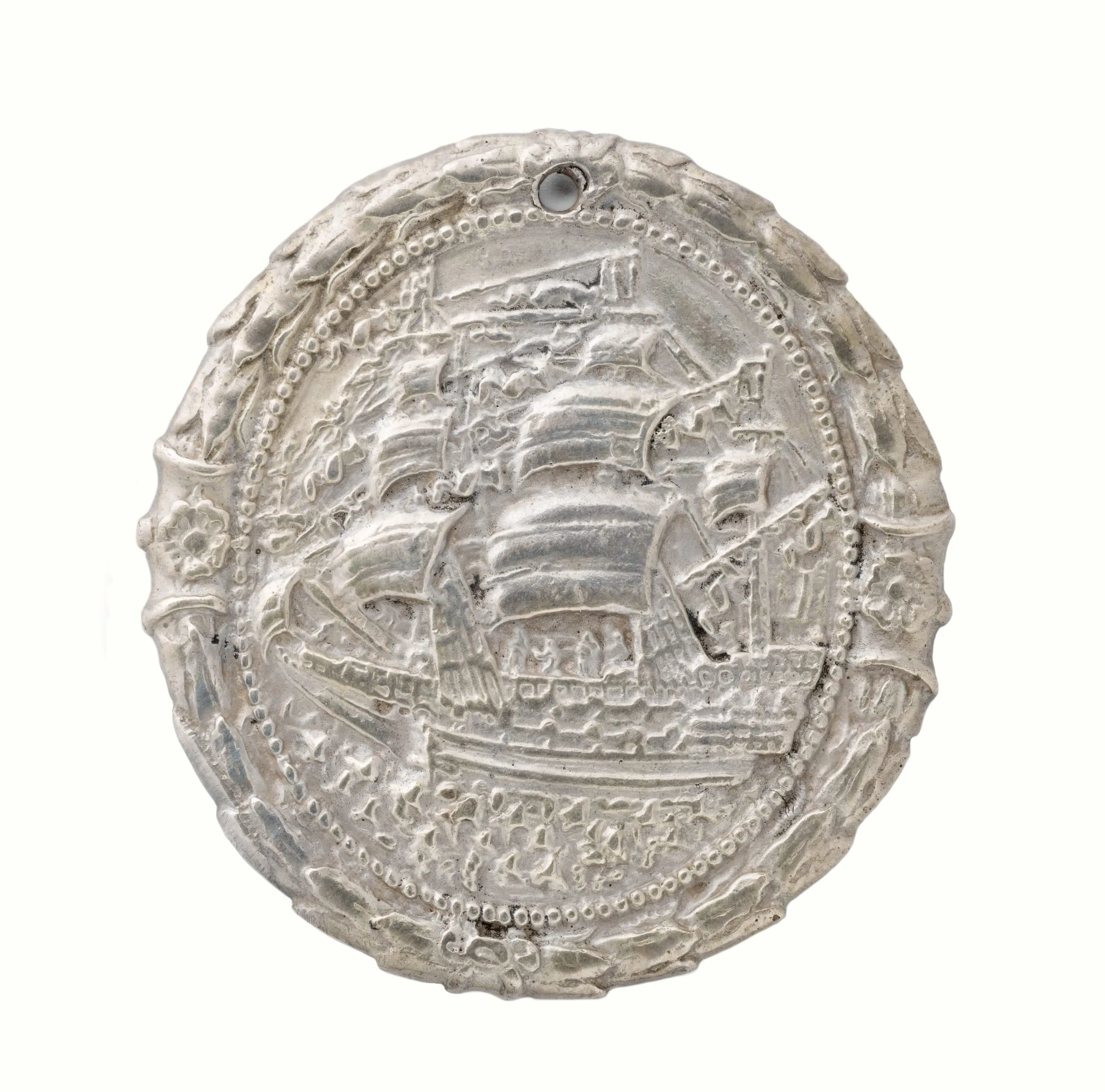 Cast silver-gray metal medallion with suspension hole, featuring low-relief image of a multi-masted sailing ship within a beaded oval border and lobed foliate outer edge
