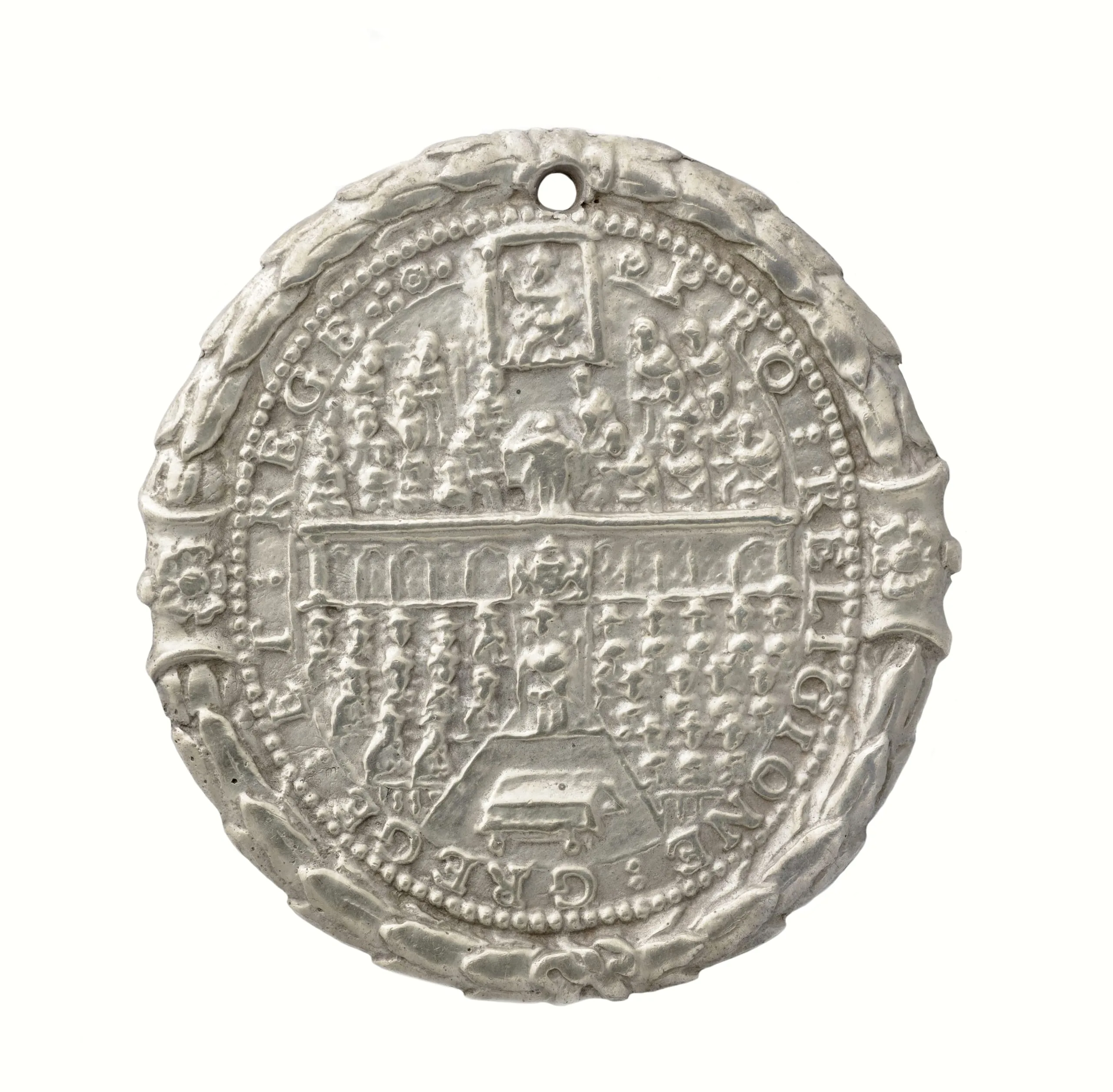 Circular cast metal medallion with suspension hole at top, featuring densely packed relief scenes of multiple figures arranged in registers, surrounded by a beaded border and foliate wreath edge, with Latin inscription along the lower rim.