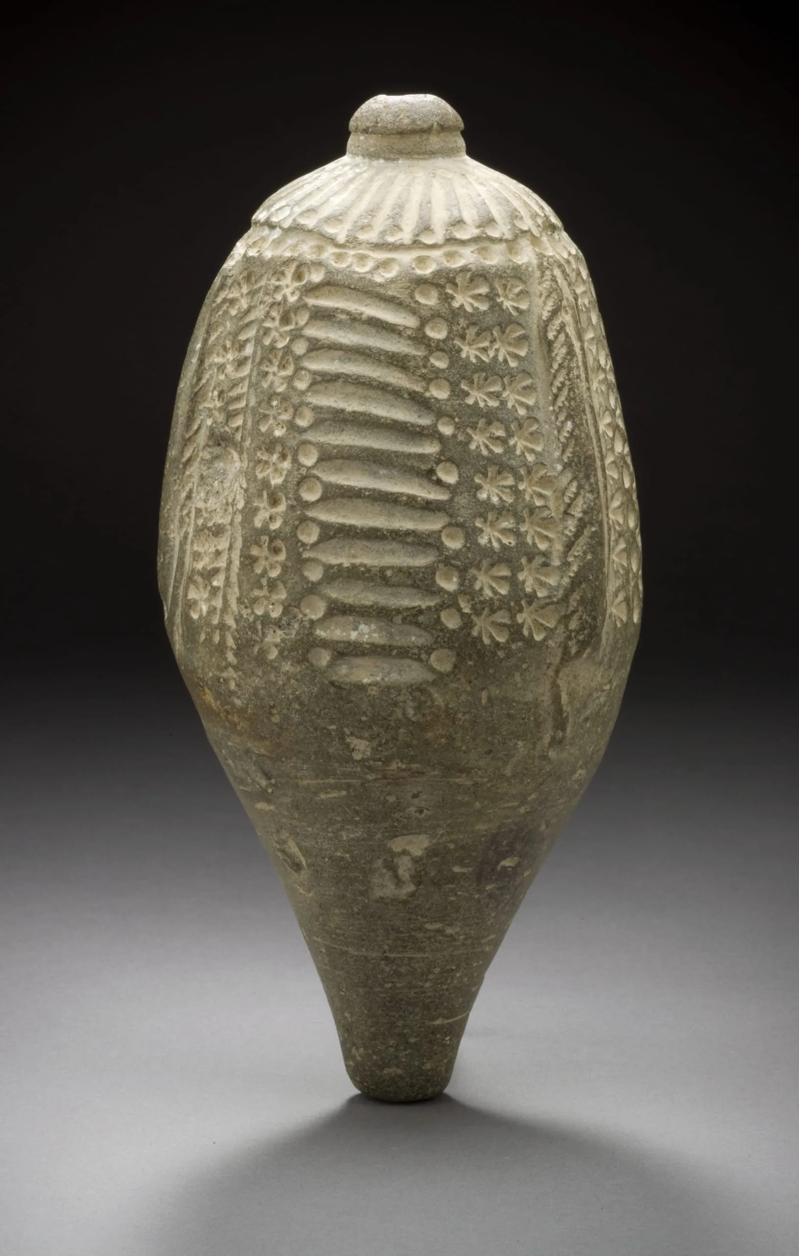 Ancient ceramic vessel with elongated oval body tapering to a pointed base, covered in raised relief decoration of ridges, rosettes, and dot patterns in muted olive gray clay