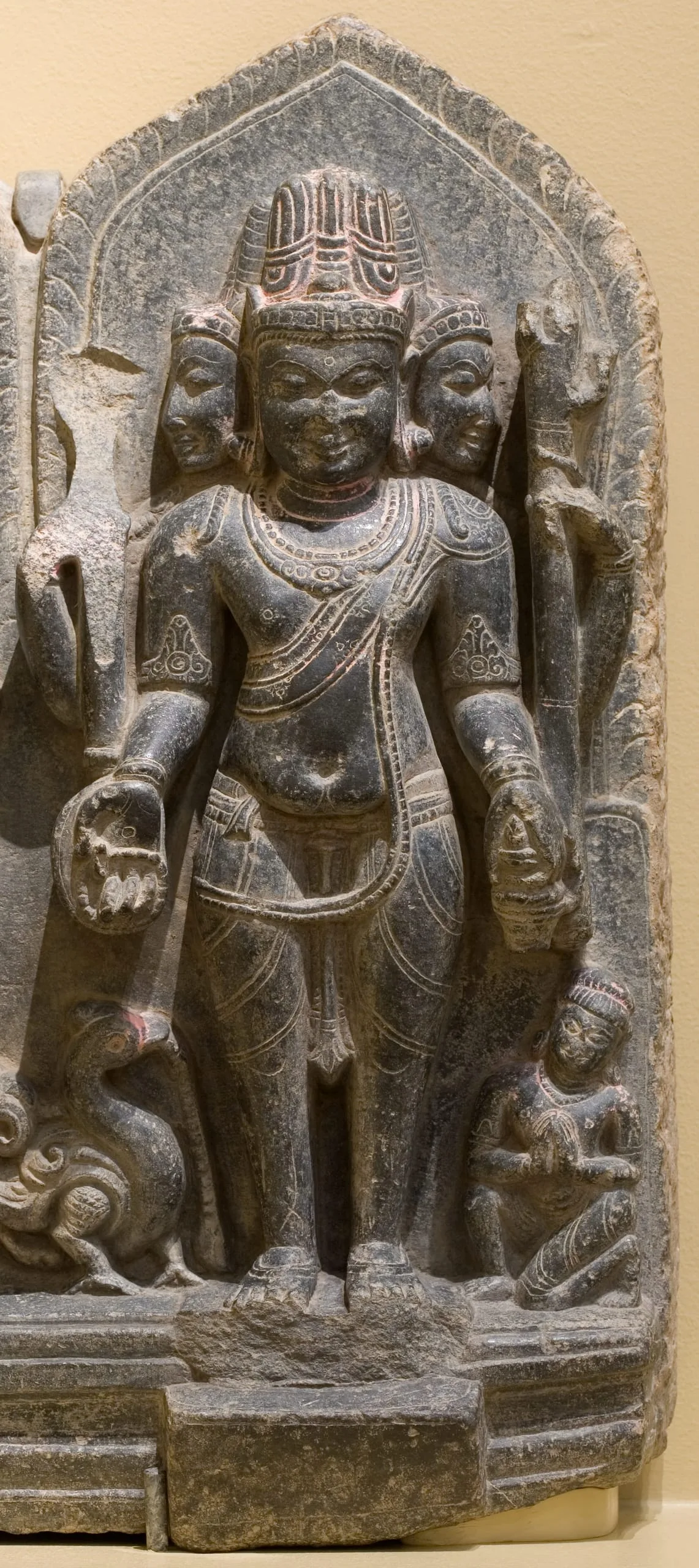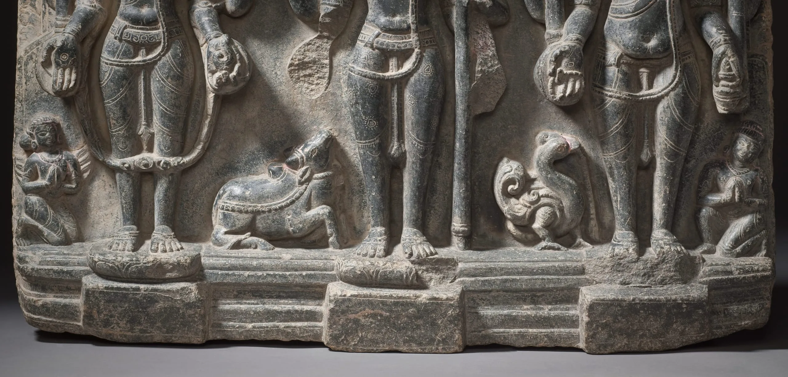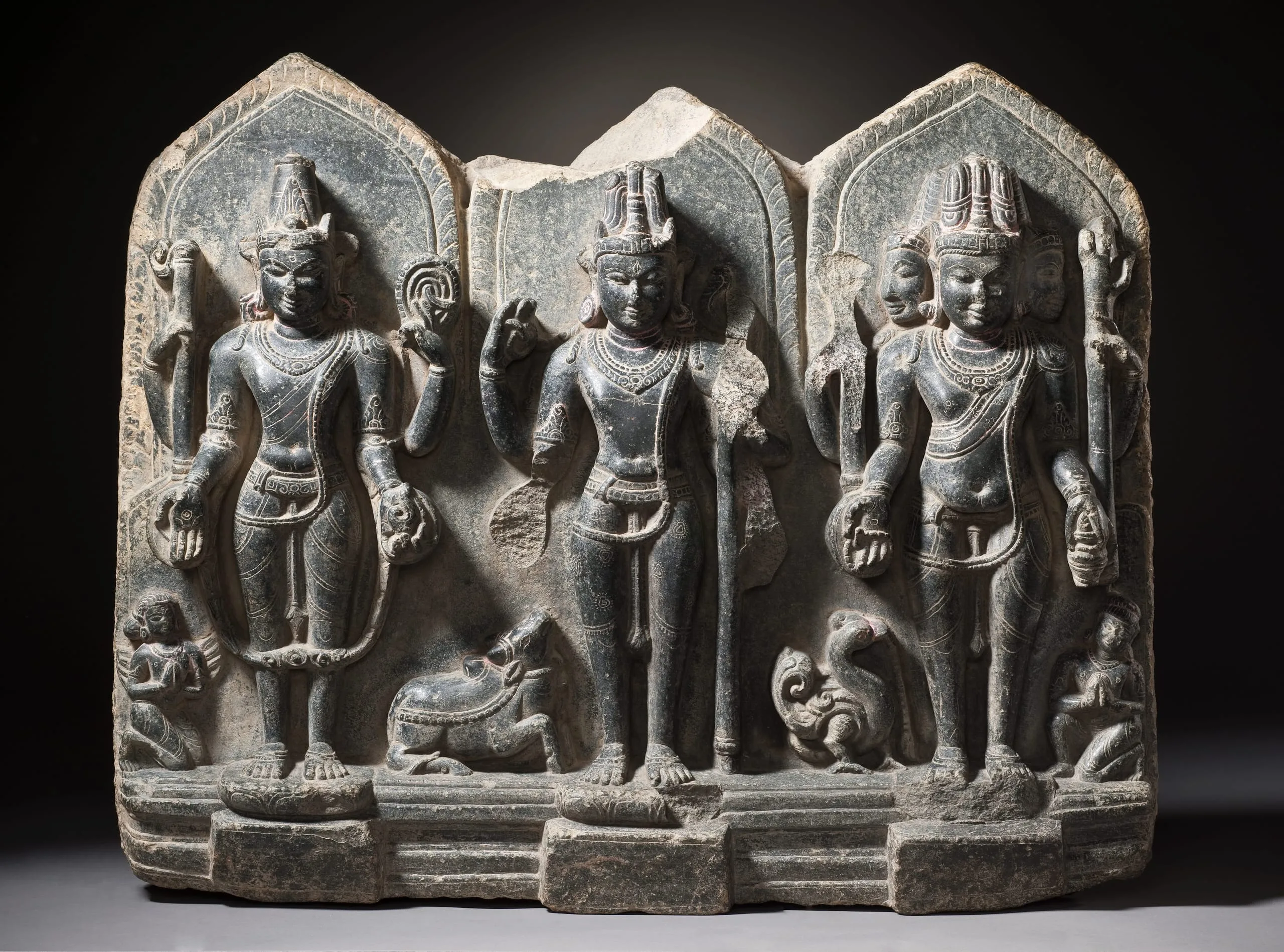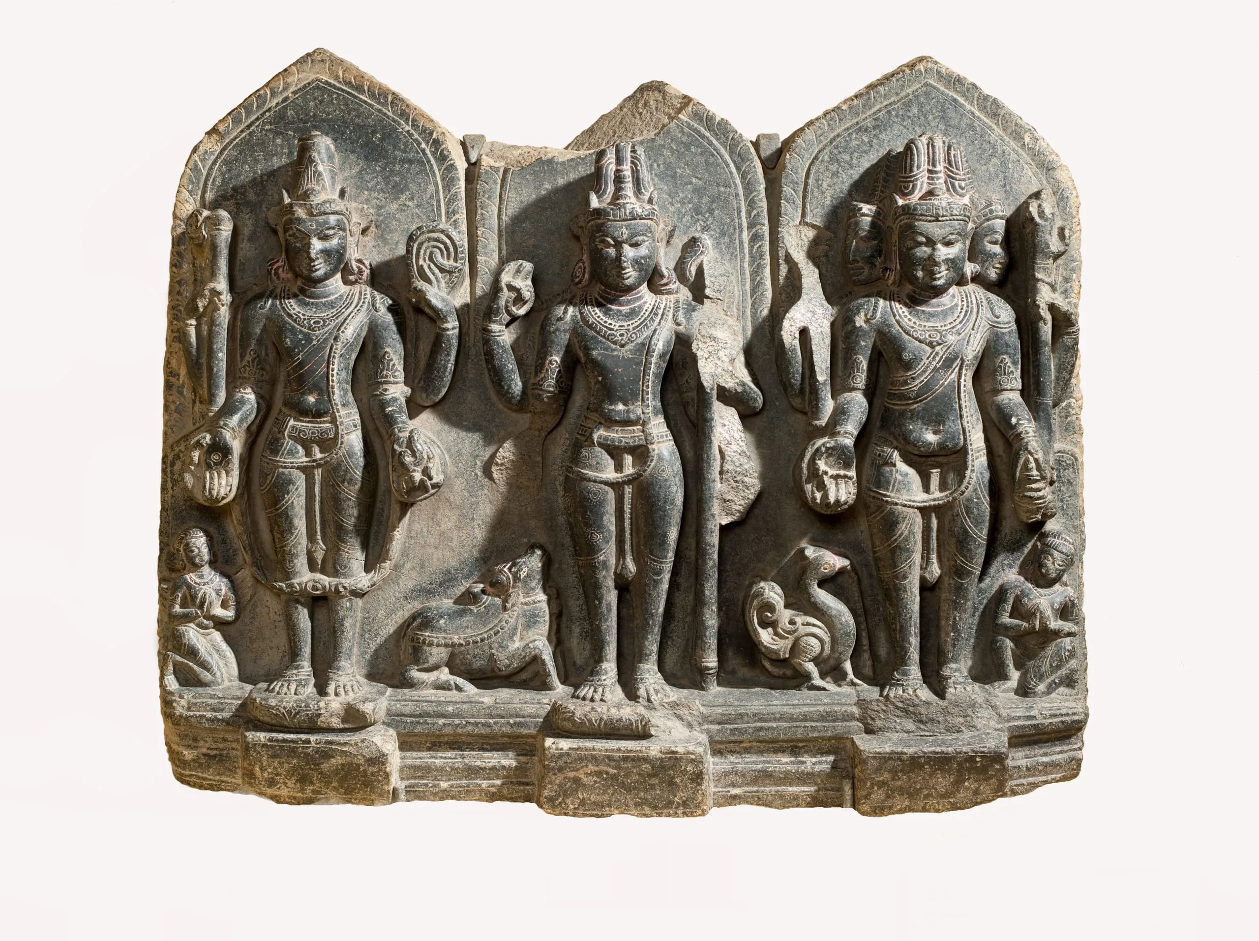 This triad represents the three principal deities of Hinduism. In the center is Shiva, the god of destruction, whose central position indicates the sculpture’s sectarian emphasis. Shiva has an ascetic’s hairstyle and has four arms that hold his symbolic attributes. His upper right hand holds a rosary. His upper left hand holds a trident. His lower hands are now broken. Shiva’s mount, the bull Nandi, looks up at him in adoration. Shiva is flanked on his left by Brahma, the god of creation. Brahma has four heads, but the fourth is at the rear and not visible. He has four arms. His upper left holds a staff. He carries an ascetic’s water pot in his lower left hand. He holds a rosary in his lower right hand. His upper right hand is broken but may have held a ritual ladle. Brahma’s mount, the gander, is on his right. On his left is a kneeling figure representing the donor of the sculpture. To Shiva’s right is Vishnu. He is crowned and wears a long forest garland (vanamala) that hangs below his knees. He has four arms. In his upper left hand he holds a discus. He carries a conch in his lower left hand. He holds a mace in his upper right hand. His lower right hand is held with the palm open in the gesture of charity (varada mudra). Vishnu’s mount, the half-avian Garuda, kneels beside him with his hands joined in the gesture of devotion (anjali mudra). Each deity wears the Brahmanical sacred thread (yajnopavita), stands on a lotus and is backed by a flaming aureole.
