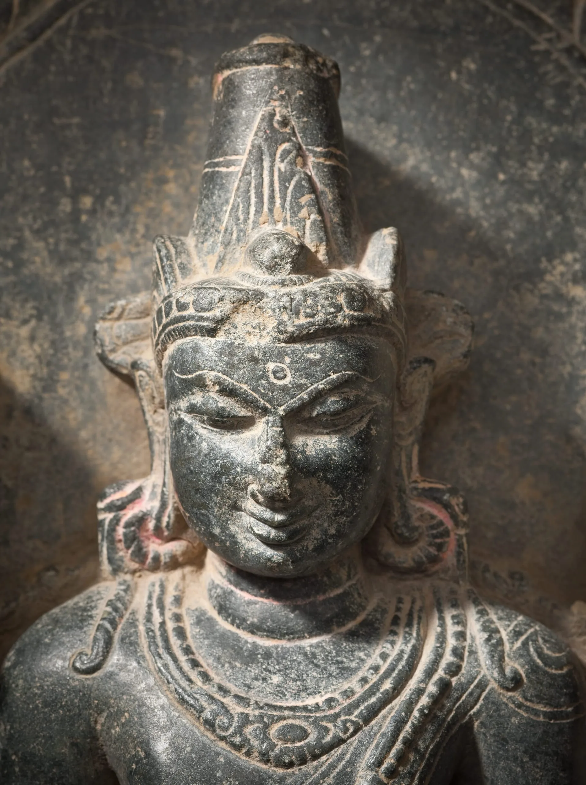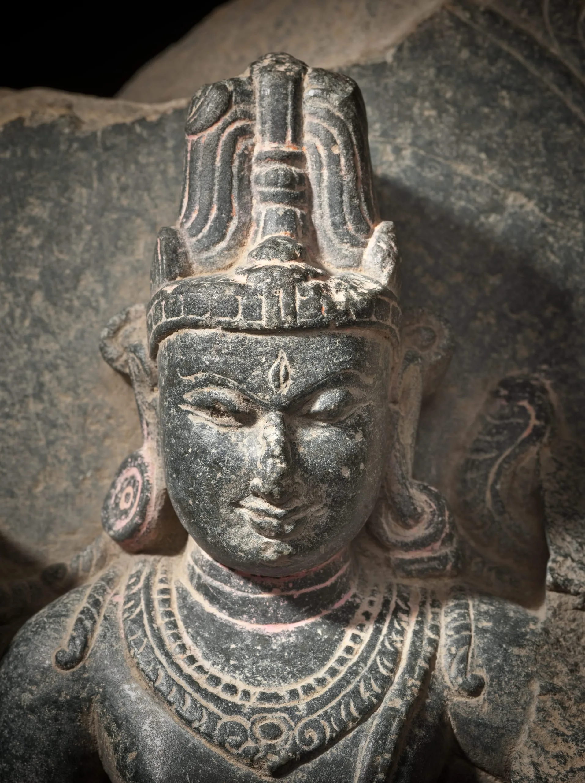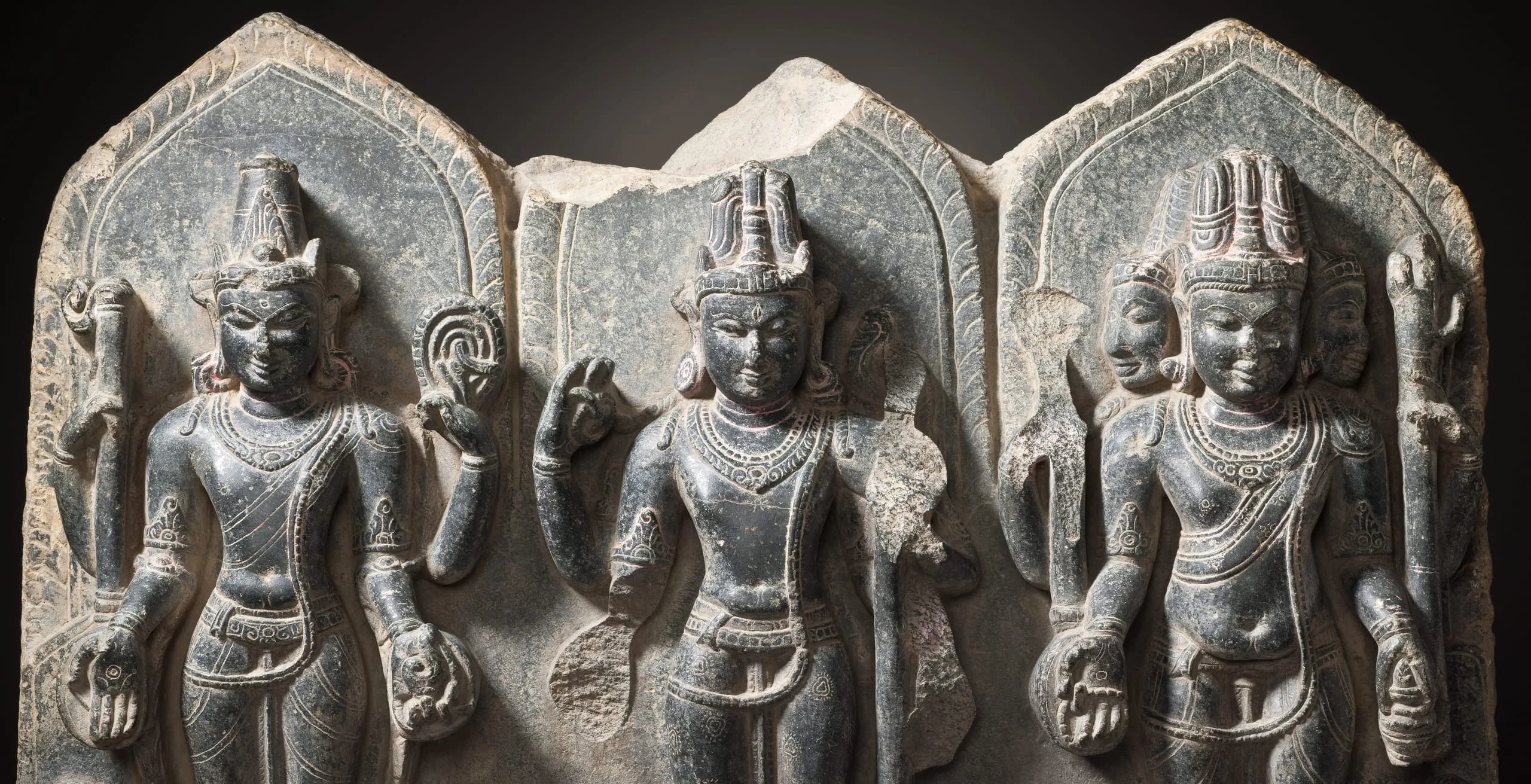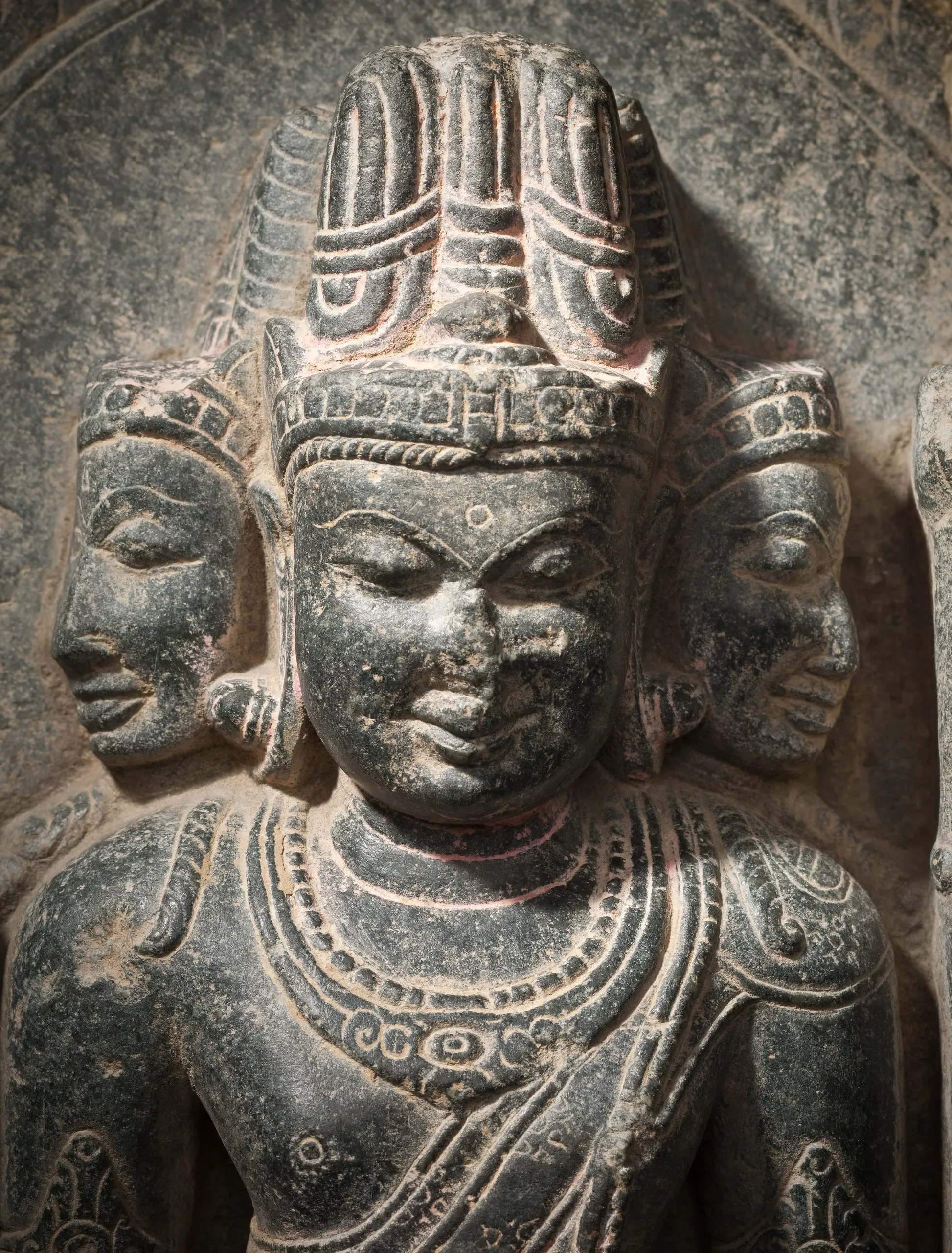 This triad represents the three principal deities of Hinduism. In the center is Shiva, the god of destruction, whose central position indicates the sculpture’s sectarian emphasis. Shiva has an ascetic’s hairstyle and has four arms that hold his symbolic attributes. His upper right hand holds a rosary. His upper left hand holds a trident. His lower hands are now broken. Shiva’s mount, the bull Nandi, looks up at him in adoration. Shiva is flanked on his left by Brahma, the god of creation. Brahma has four heads, but the fourth is at the rear and not visible. He has four arms. His upper left holds a staff. He carries an ascetic’s water pot in his lower left hand. He holds a rosary in his lower right hand. His upper right hand is broken but may have held a ritual ladle. Brahma’s mount, the gander, is on his right. On his left is a kneeling figure representing the donor of the sculpture. To Shiva’s right is Vishnu. He is crowned and wears a long forest garland (vanamala) that hangs below his knees. He has four arms. In his upper left hand he holds a discus. He carries a conch in his lower left hand. He holds a mace in his upper right hand. His lower right hand is held with the palm open in the gesture of charity (varada mudra). Vishnu’s mount, the half-avian Garuda, kneels beside him with his hands joined in the gesture of devotion (anjali mudra). Each deity wears the Brahmanical sacred thread (yajnopavita), stands on a lotus and is backed by a flaming aureole.