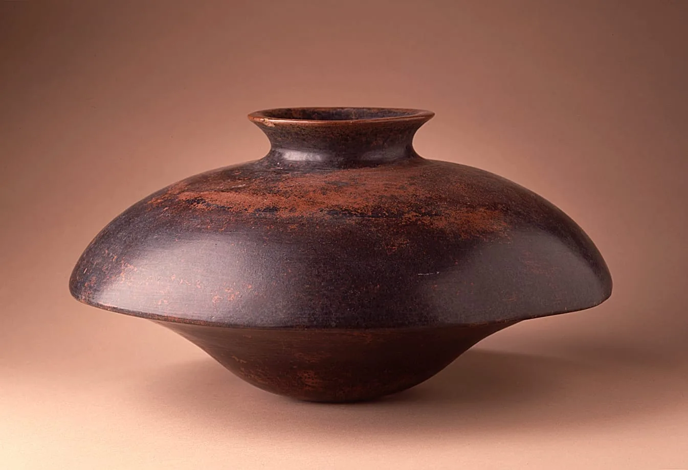 Ceramic vessel with wide, flattened body, narrow foot, and small flared mouth, with mottled eggplant-purple and russet-brown burnished surface