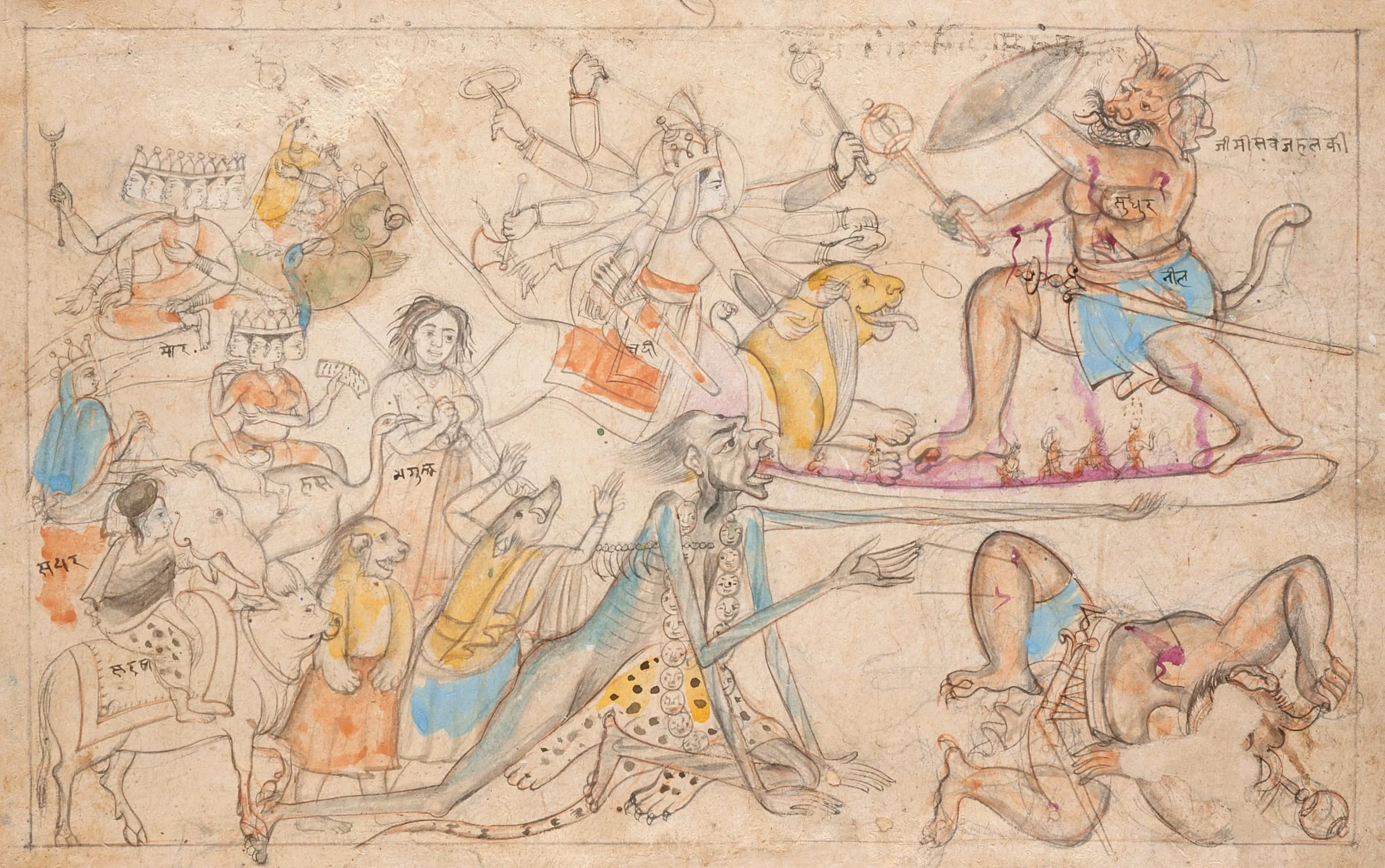 This preparatory drawing likely illustrates the climax of Chapter 7, “The Slaying of Chanda and Munda.” After seeing the Goddess in her form of Parvati and being overwhelmed by her beauty, they reported their encounter to their demonic overlord Shumba, who sought to marry the Goddess. She responded that she would only marry someone who defeats her in battle. Shumba was incensed by her refusal and sends Chanda and Munda and their armies to kidnap her. When the demons attacked the Goddess, her face turned dark from anger and the horrific goddess Kali emerged from her brow. The emaciated Kali devoured the armies by capturing them with her lolling tongue and grinding them to dust with her teeth. Chanda and Munda then assailed the Goddess, who furiously beheaded them. Here, Chanda has been slain and Munda charges at the Goddess. Joining the fray behind her are several Mother Goddesses, including Vaishnavi on Garuda, Kaumari on a peacock, Brahmani on a swan, Indrani on an elephant, and Maheshvari on a bull. There are color notations and labels for some of their mounts. Comparable renditions are in the Metropolitan Museum of Art, New York (1997.390 and 2008.359.11).
