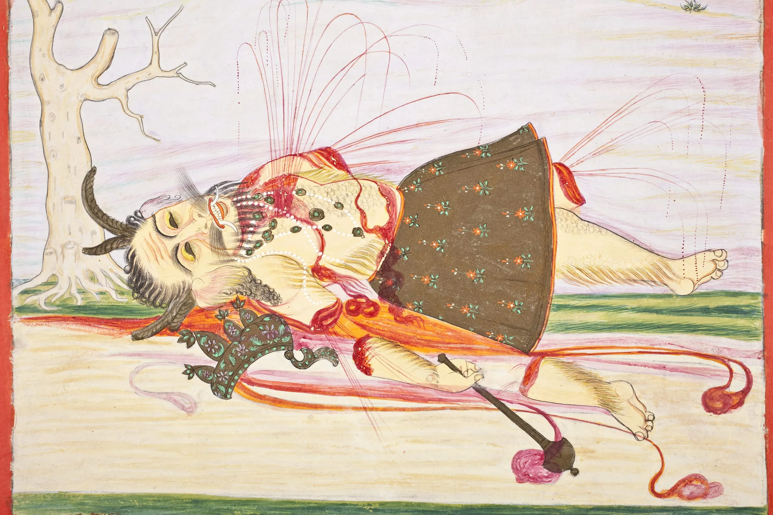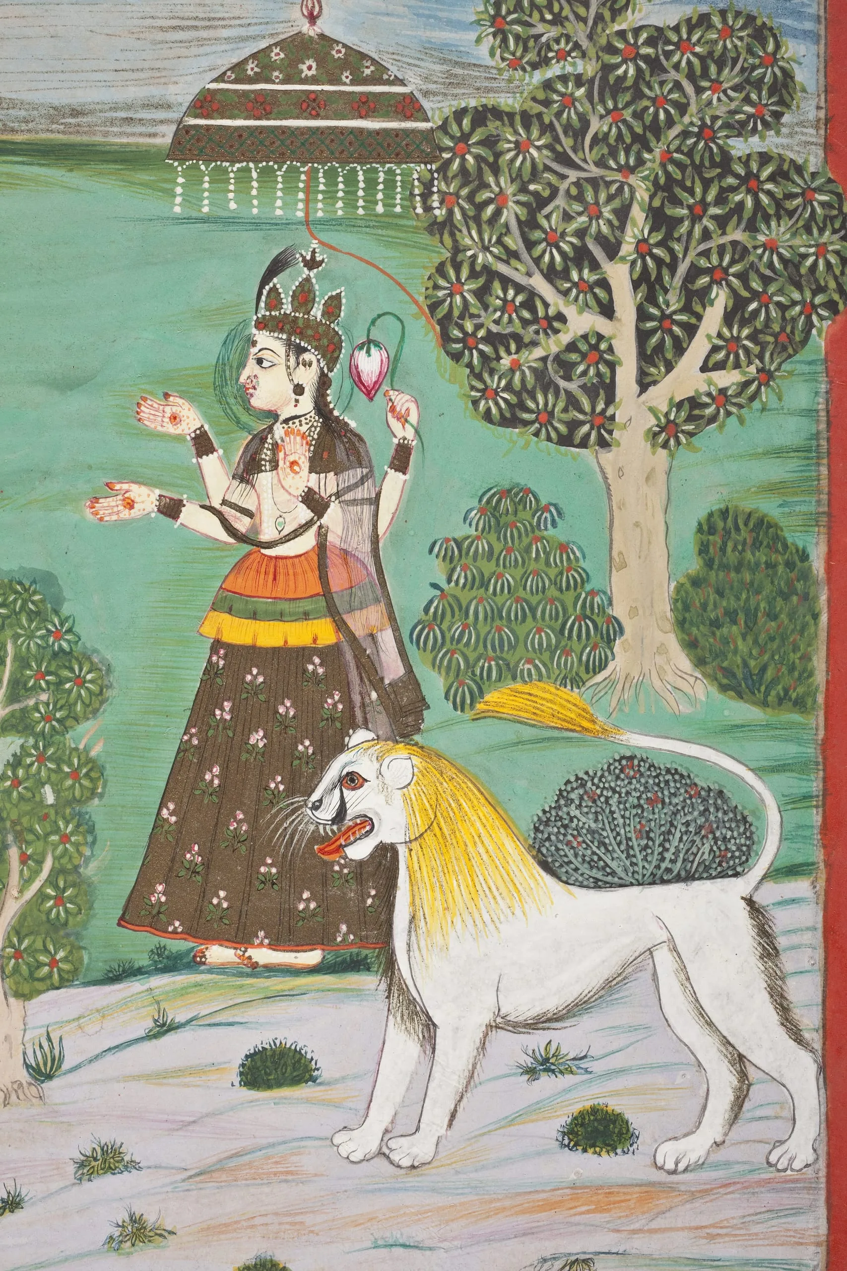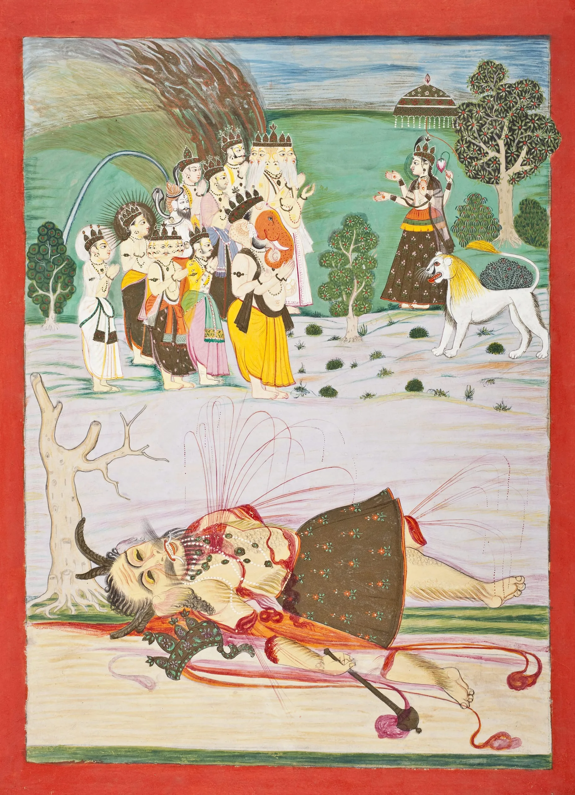Here, the Shaiva and Vedic gods of Hinduism are paying homage to the Goddess after her defeat of a demonic titan. The Goddess is likely a form of Parvati. She is crowned with pale skin and four arms. She carries a lotus bud in her upper left hand. Her remaining three hands are held in symbolic gestures: lower left, ‘fear-not’ (abhaya mudra); lower right, ‘gift-giving’ (varada mudra); upper right, indeterminate. Each hand has a sacred marking in the palm (lakshana). She stands under an honorific parasol and has a lion mount. The gods standing in adoration are the elephant-headed Ganesha, the four-headed Brahma with white beards, the ascetic Shiva, the thousand-eyed Indra, the six-headed Karttikeya (the sixth head is not visible), the Sun-God Surya with a golden nimbus, the Moon-God Chandra with a white nimbus, and three generic gods. The slain supine demon has severed limbs with streams of blood still spurting.