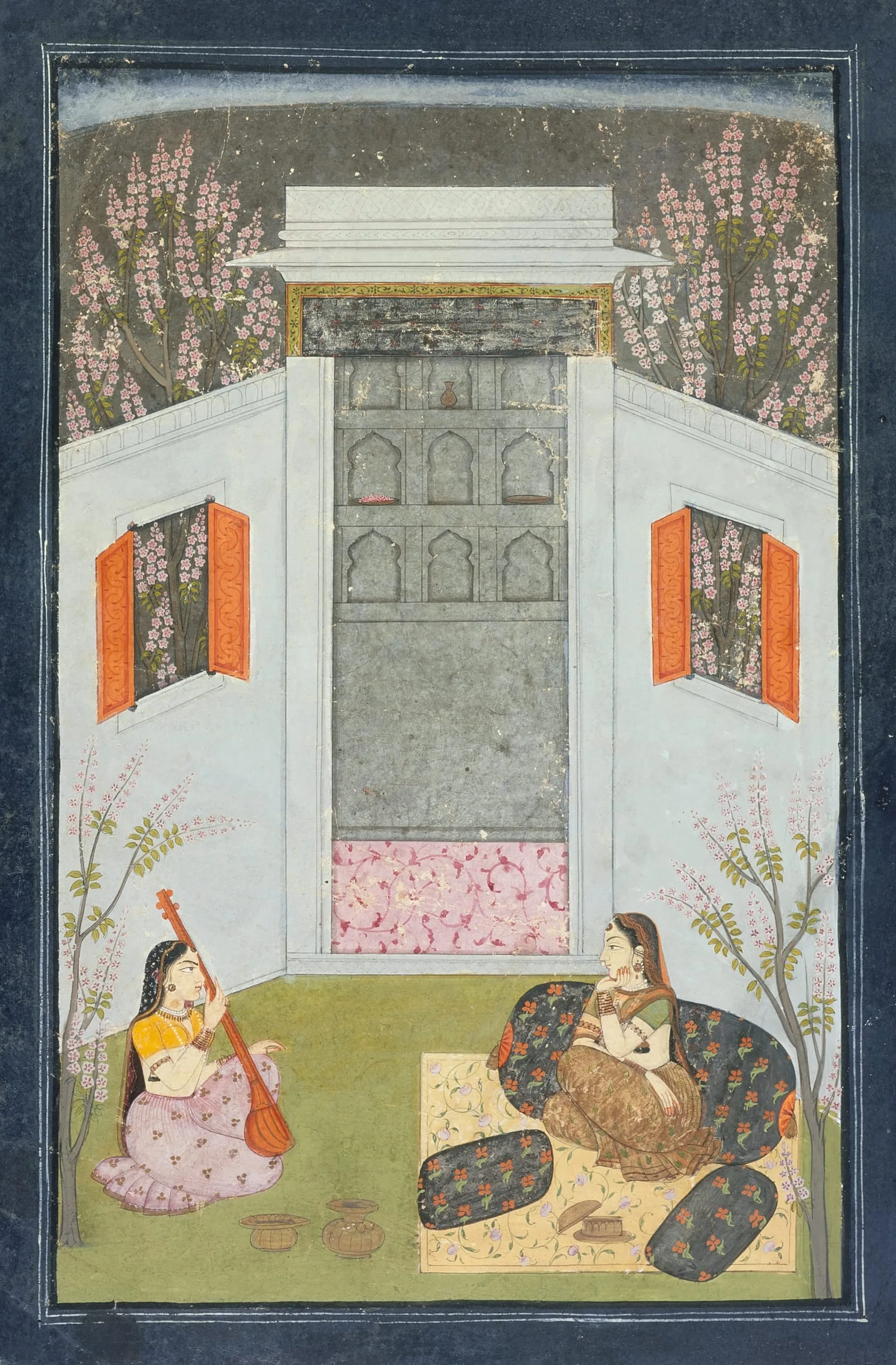 Patamanjari Ragini is the fourth wife of Bhairava Raga in the predominant ragamala (garland of melodies) classification system generally known as the Rajasthani system. It is an early morning melody associated with Autumn (September–November). The melody’s name is derived from the Sanskrit prathama manjari (first blossom). Patamanjari Ragini is envisioned as a courtly woman distraught by the absence of her lover and sitting dejectedly with her head supported by her hand. She is being consoled by a confidante, who is occasionally shown singing or, as is the case here, playing a drone instrument (tambura). They are seated in a palace courtyard rendered symmetrically in linear perspective. See also M.77.154.8 and AC1999.127.26.