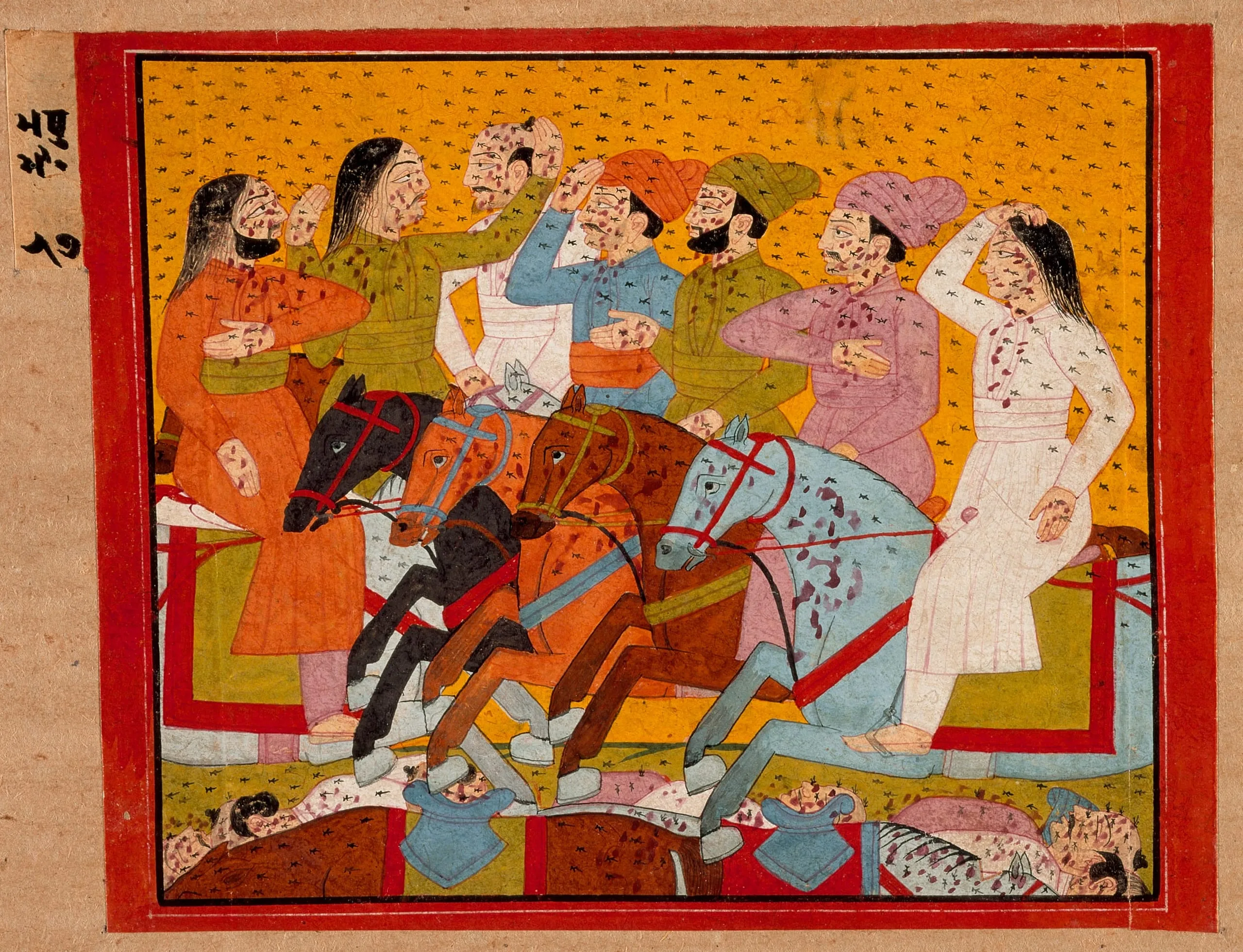 The lengthy text on the reverse is written in a mixture of takri and sharada scripts. It does not describe The Attack of Bees depicted on the obverse. Rather, it narrates the storyline leading up to The Attack of Bees incident. This indicates that the text on the reverse was to be read while its corollary painting in the series was being viewed. Subsequent verses of the published text describe The Attack of Bees: “. . . like Tiddi [locust] eats/destroy the harvest field, one each [soldier attacking Madhu] thousands of bees glued and their sting was as painful as burnt by pieces of coal fire. You like a swan brighten [the city of] Kataka . . .” (Madhumalati-varta 517-520) (Translation by Naval Krishna.)