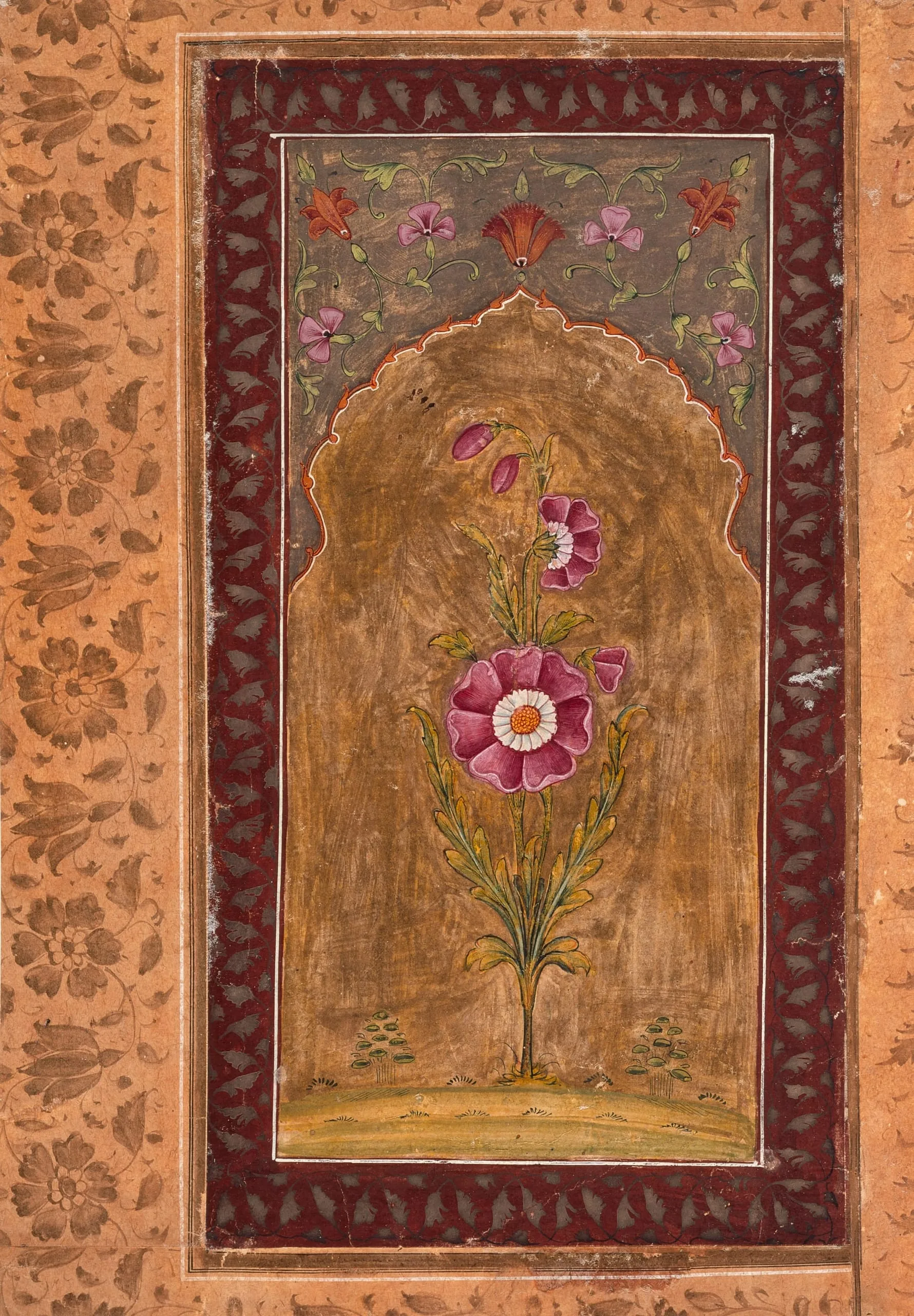 In the Deccan, however, more complex or imaginary flowers were popular, such as this image of what may be a stylized opium poppy (Papaver somniferum). Set against a gold background under a lobed arch or mihrab (prayer niche), it has a large central open blossom, two flowers shown in profile, two flower buds, and elongated leaves with broadly serrated edges. In the spandrels are flowering vines with irises, poppies, and a dianthus.