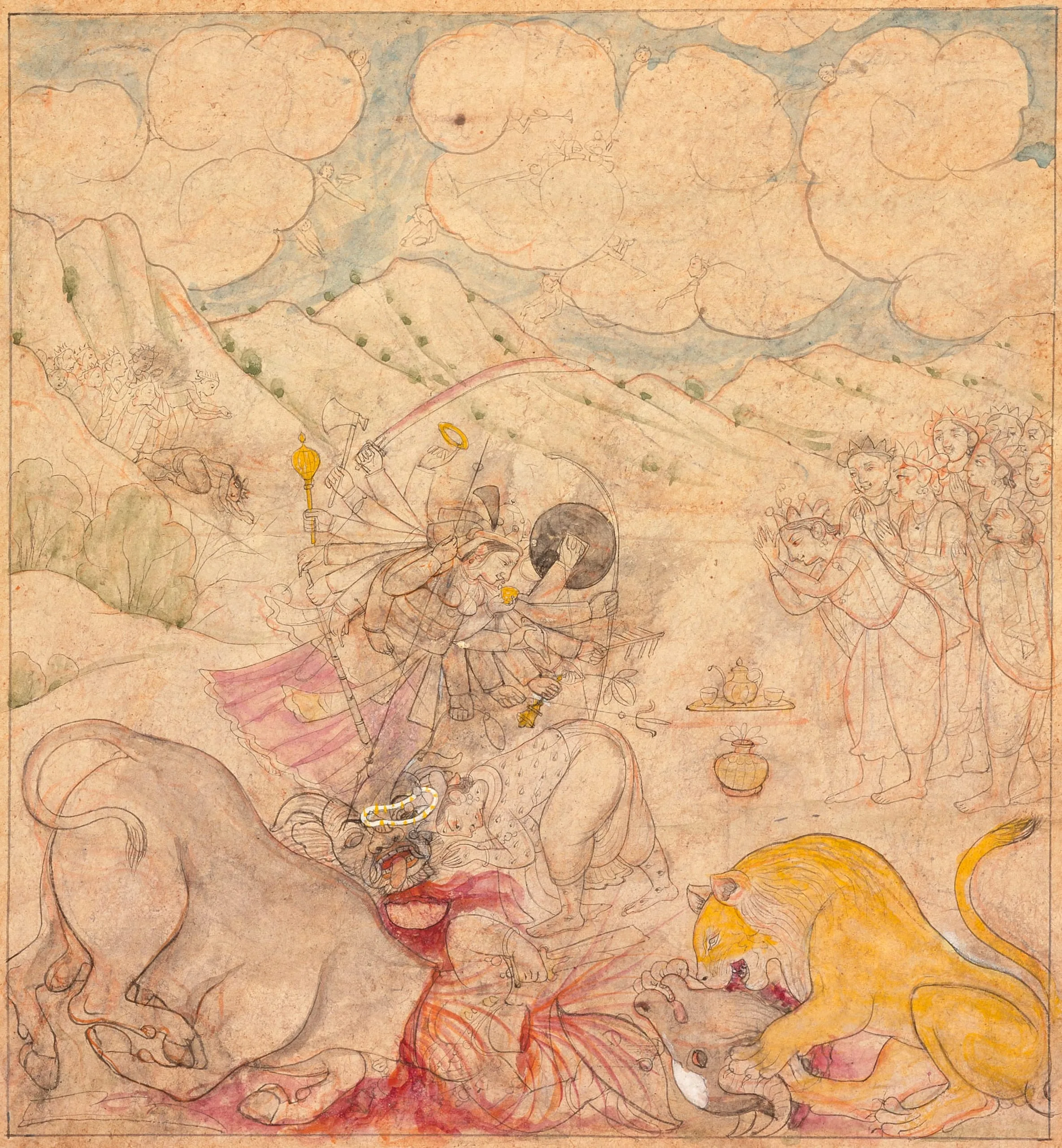 This unfinished or preparatory drawing illustrates the climax of Chapter 3, “The Slaying of Mahishasura.” After the demon Mahishasura had assumed his sequential manifestations as a buffalo, lion, warrior with a sword, and elephant, each of which was defeated by the Goddess, Mahishasura resumed his buffalo form and then began to revert to his true demonic form. As his head emerged from the buffalo’s mouth, the Goddess jumped on his neck and beheaded him (Devimahatmya 3:39-42). The Goddess’s lion mount maws the buffalo’s decapitated head. The Goddess is drinking one of several cups of wine, which she drank to energize herself during the battle. Beside her is tray with a ewer and wine cups, and a lota with a lotus. The thousand-eyed Indra bows in reverence. The gods and celestial divinities herald the auspicious event.