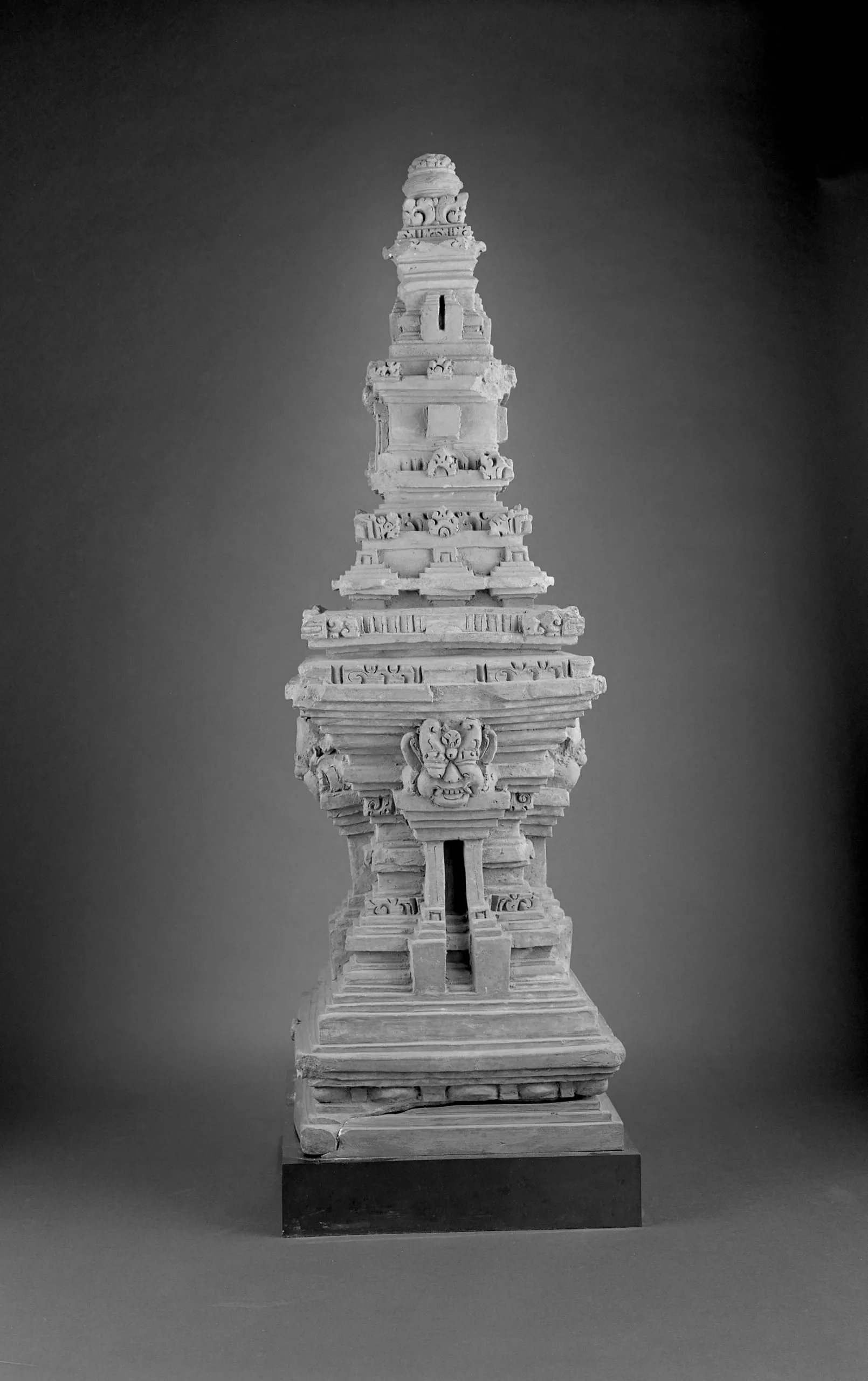 A comparable but much smaller Eastern Javanese earthenware chandi is in the Wereldmuseum, Leiden. See H. R. A. Muller, Javanese Terracottas: Terra Incognita (Lochem, The Netherlands: Tijdstroom, 1978), pp. 70 and 103, pl. 125. Similar miniature temples found in Trowulan are in the Museum Majapahit, Trowulan.