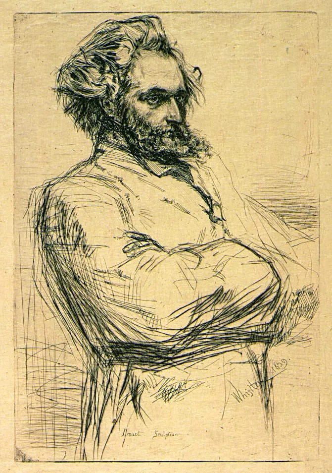 Whistler's prints reveal another side of his perception. This etched portrait of the French sculptor Charles Drouet is a telling study of artistic personality as well as a masterful record of appearance. Although Whistler has boldly simplified the body, he observes the details of facial structure and texture closely: the virile beard, the slightly careworn brow, the shadowed eyes.