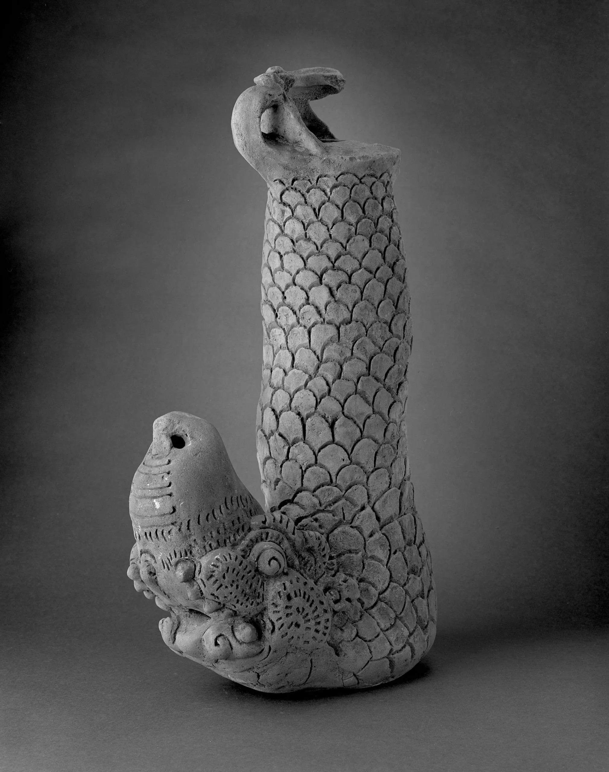 A makara (sea monster) is a mythical aquatic creature symbolic of fecundity that is a varying composite of diverse animals. The most common hybrid form, as represented in a Nepalese repoussé gilt copper alloy sculpture (M.85.279.6), has the trunk and head of an elephant, the body and feet of a crocodile, and the foliated tail of a fish or peacock. This Eastern Javanese earthenware makara has the trunk of an elephant, the head and jaws of a crocodile, and the scales and flexible body of a fish. The now-fragmentary upraised hollow tail was originally surmounted by an offering stand. Its surviving elements include a floral medallion and a handle with a serpent head junction. For a comparable makara offering stand, see John. N. Miksic and Endand Sri Hardiati Soekatno, eds., The Legacy of Majapahit (Singapore: National Heritage Board, 1995), p. 166, no. 80.