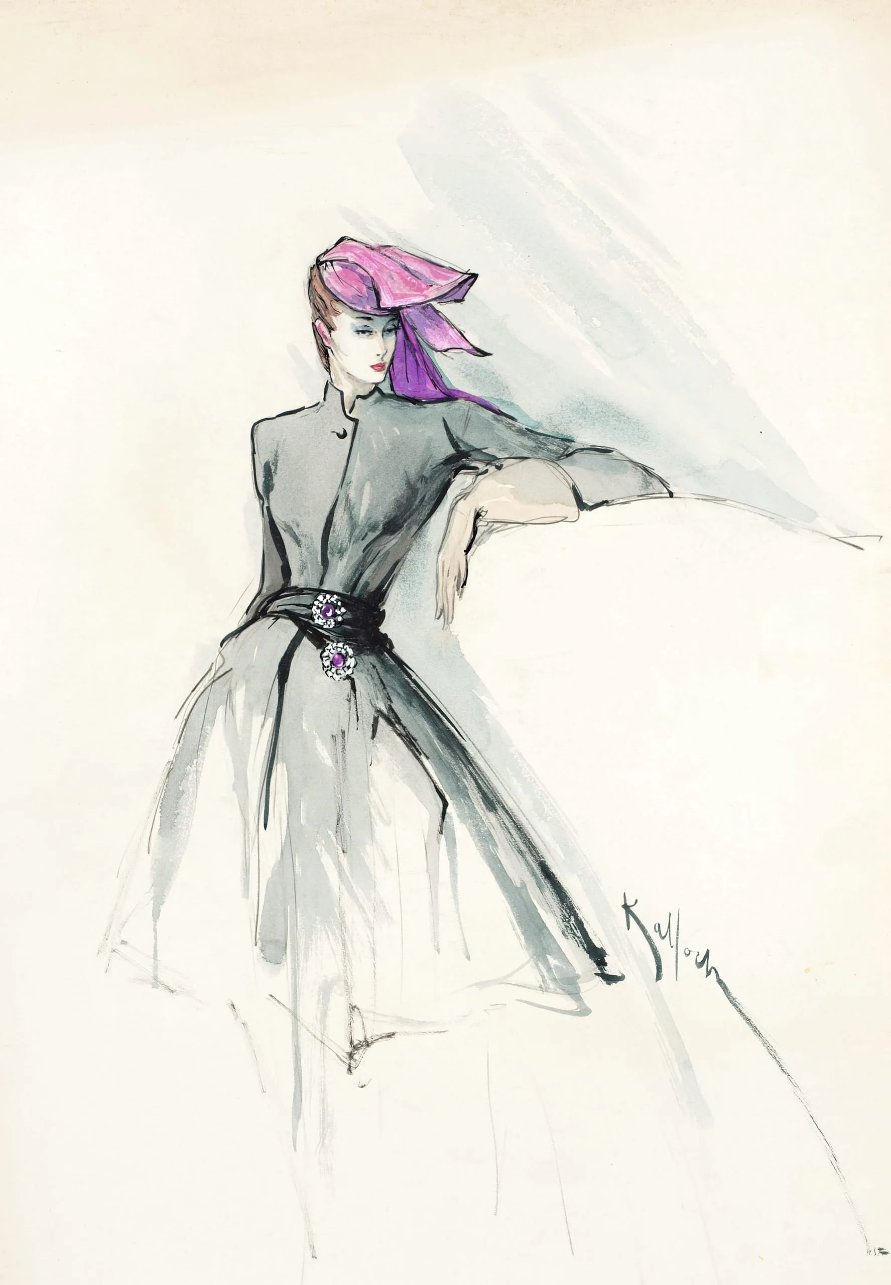 Fashion illustration in ink and wash on cream paper, a figure in a full-skirted gray dress with a wide pink and purple hat, bold gestural brushwork