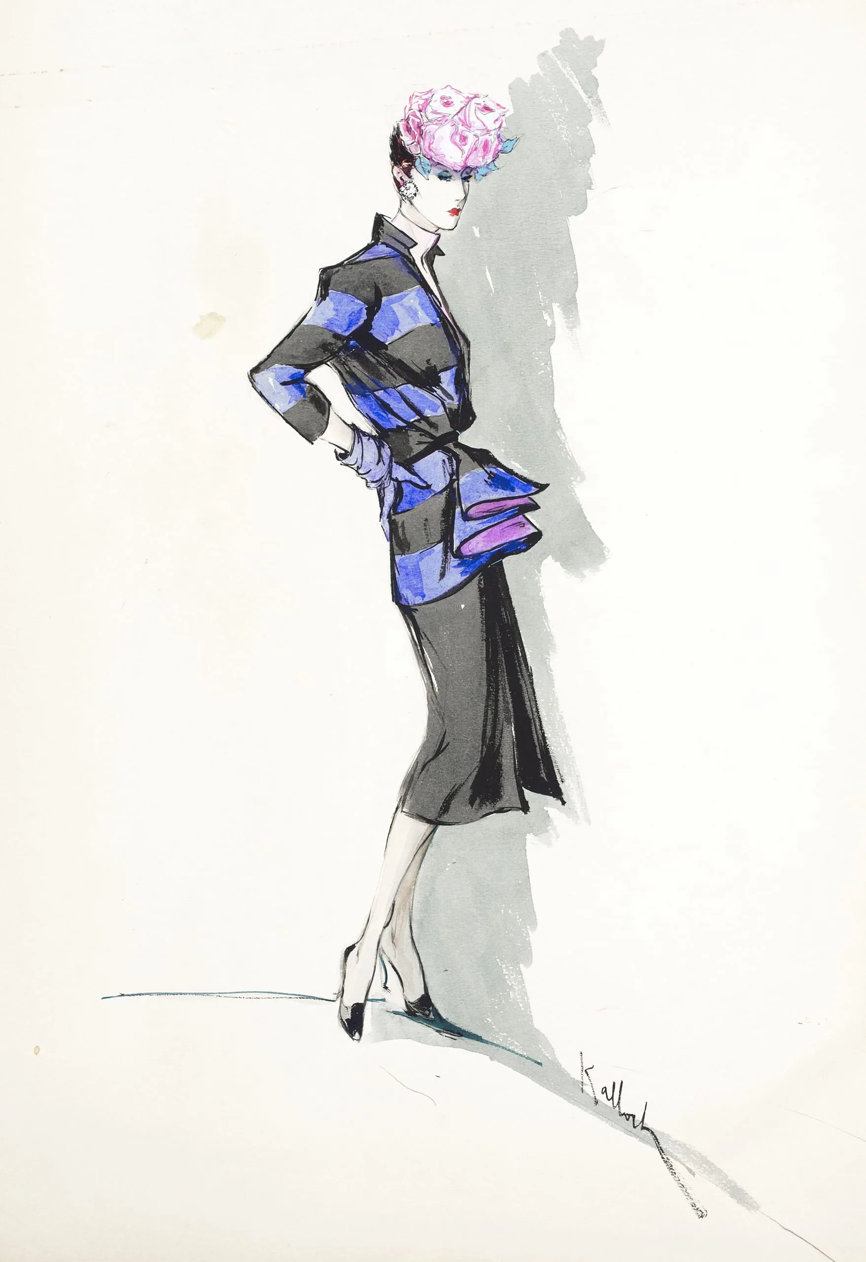 Fashion illustration in ink and watercolor on white paper, full-length profile of a woman in a cobalt-striped jacket with peplum, black skirt, and pink floral hat