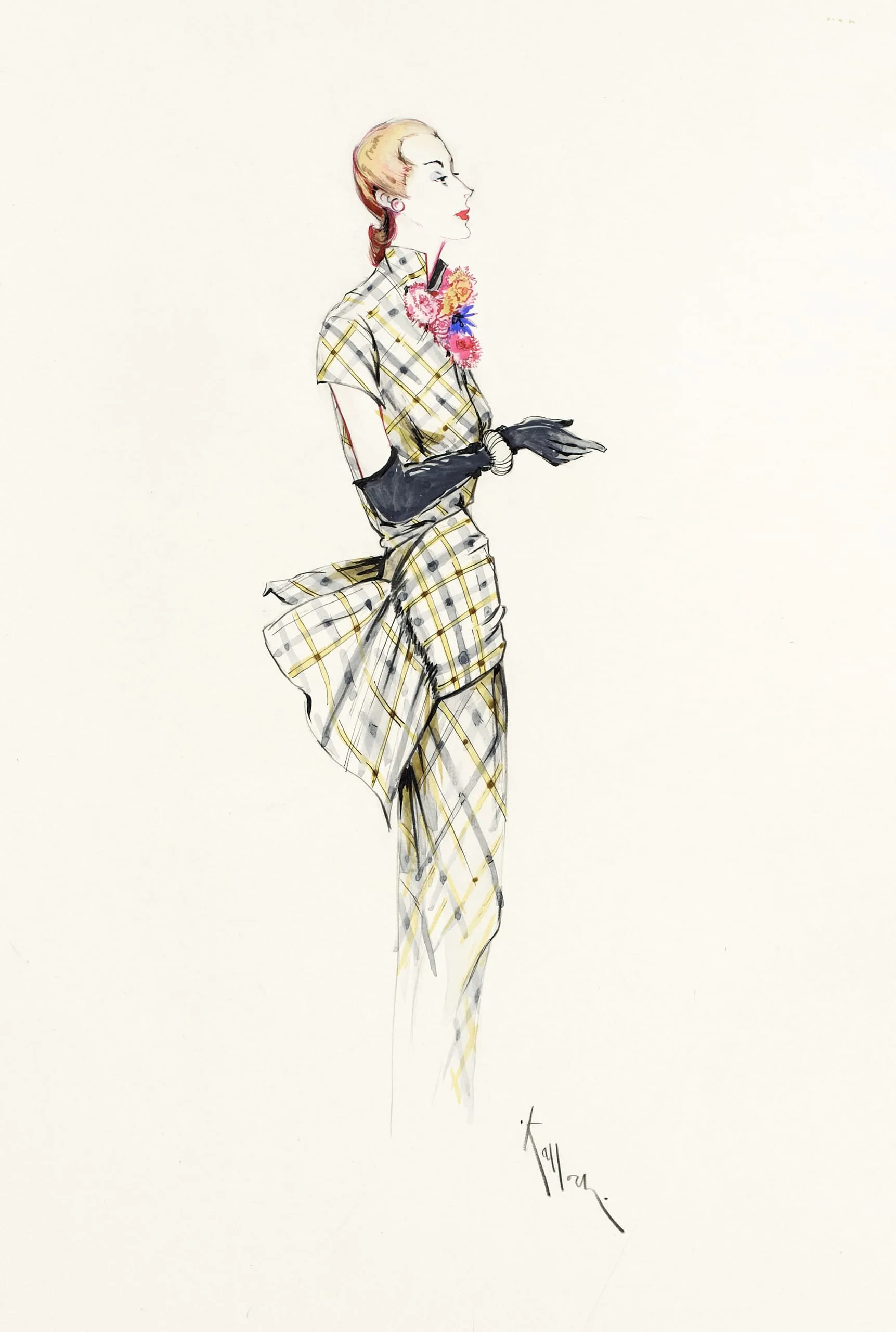 Fashion illustration in ink and watercolor on cream paper, female figure in profile wearing a plaid two-piece ensemble with long black gloves and a floral corsage