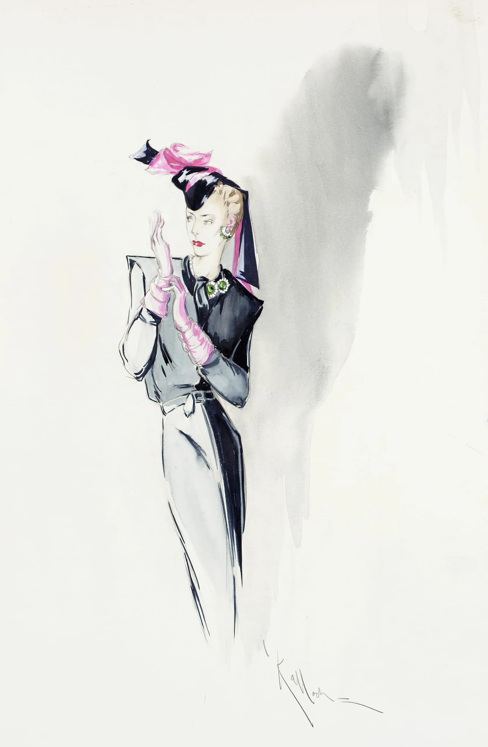 Fashion illustration in ink and watercolor wash on off-white paper, full-length female figure in a gray outfit with a dark capelet, pink gloves, and a veiled hat trimmed with a pink bow