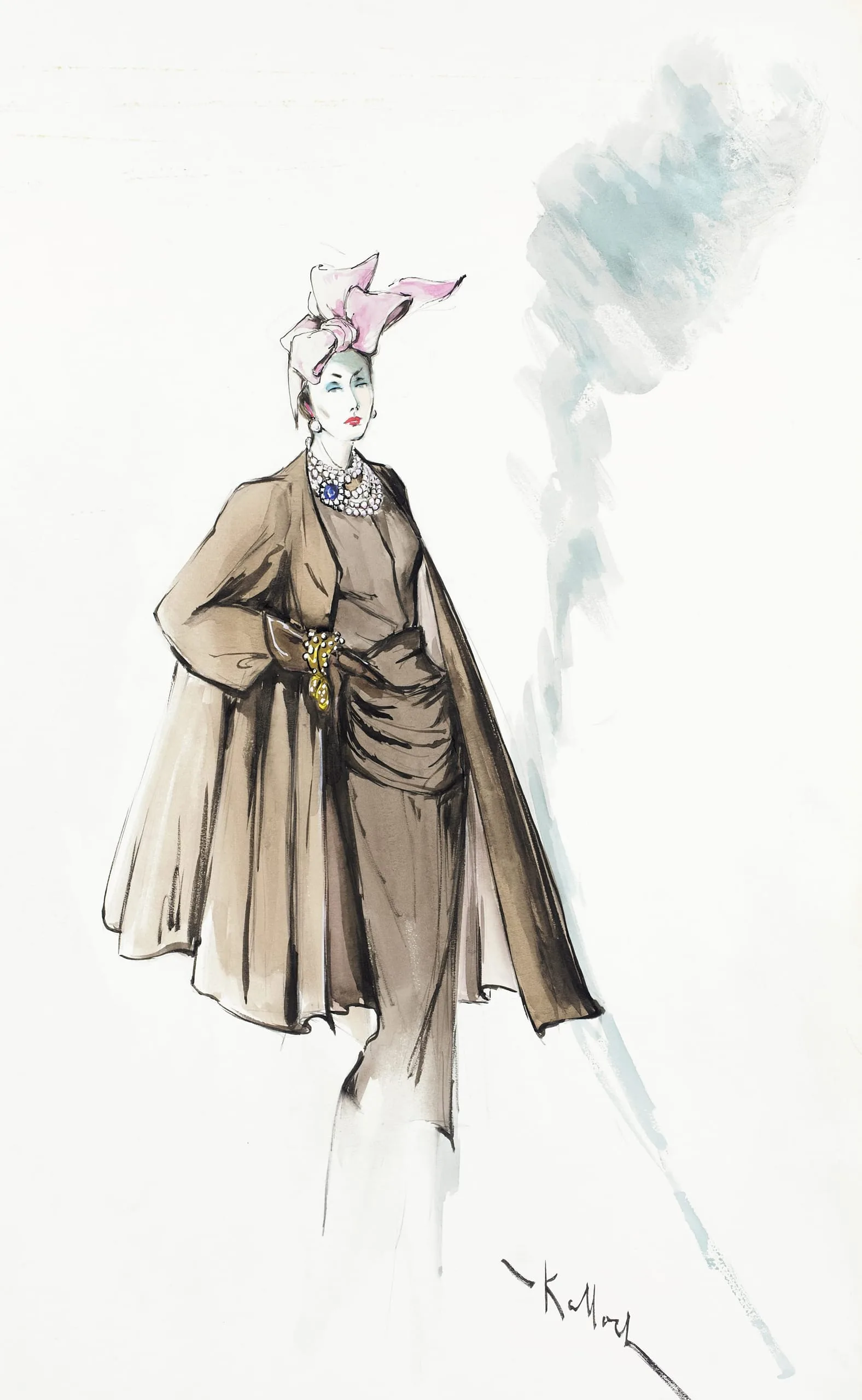 Fashion illustration in ink and watercolor wash, full-length figure in taupe cape and fitted dress, with a pink bow headpiece and pearl necklace