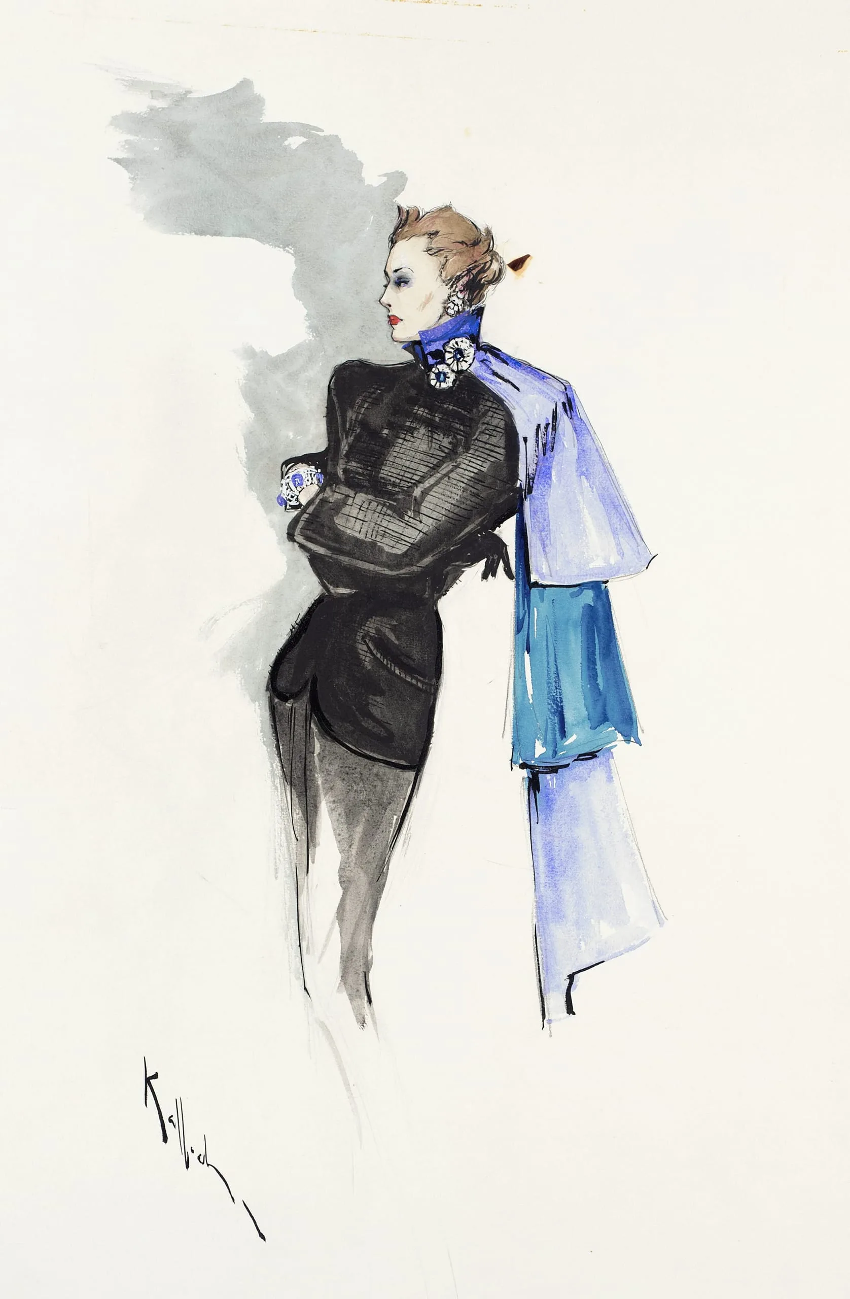 Watercolor and ink fashion illustration of a woman in profile wearing a black fitted outfit with a blue-and-teal draped fabric over one shoulder, on cream paper
