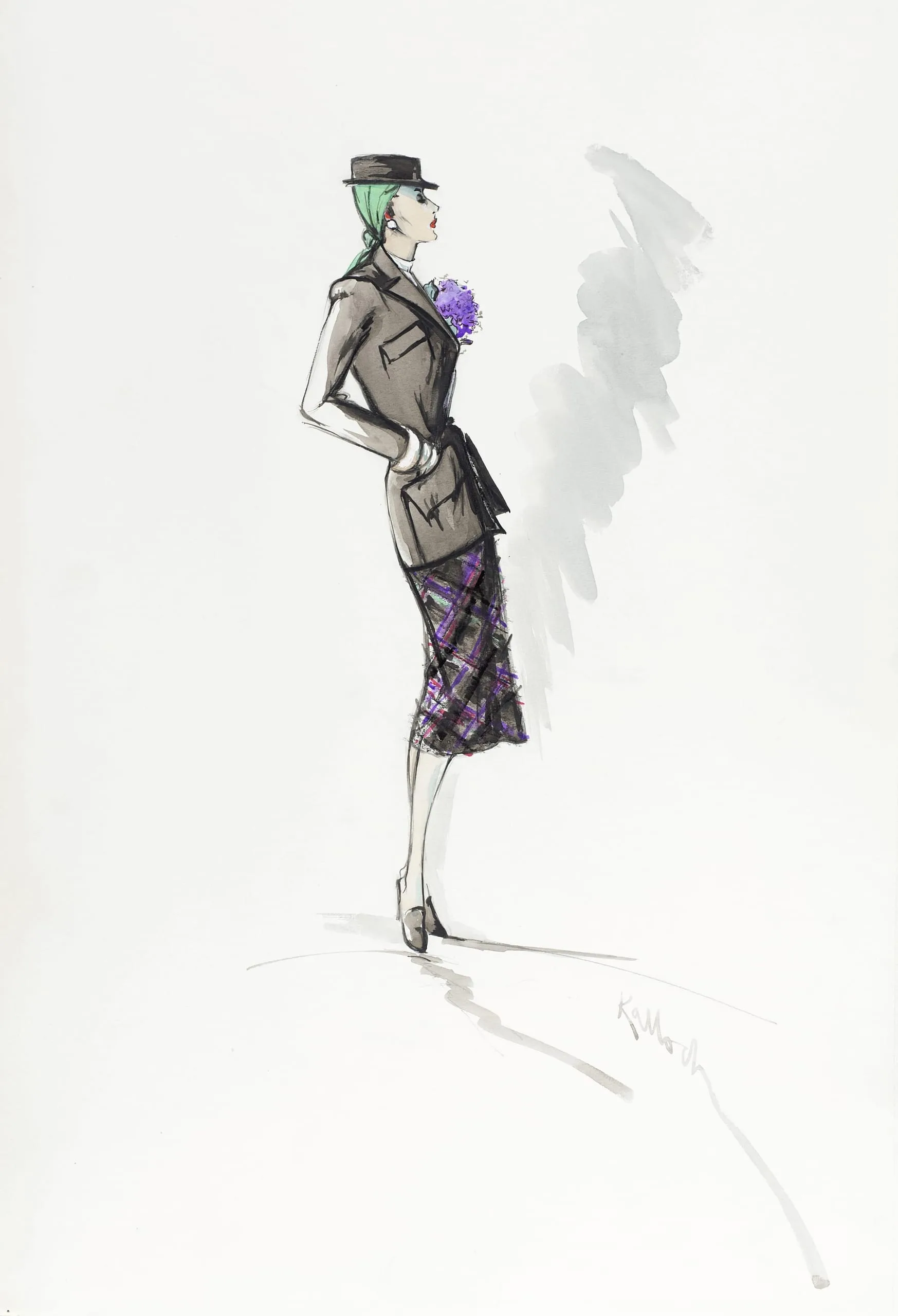 Fashion illustration in ink and marker on white paper, full-length female figure in profile wearing a plaid skirt, khaki jacket, and black boater hat with green hair