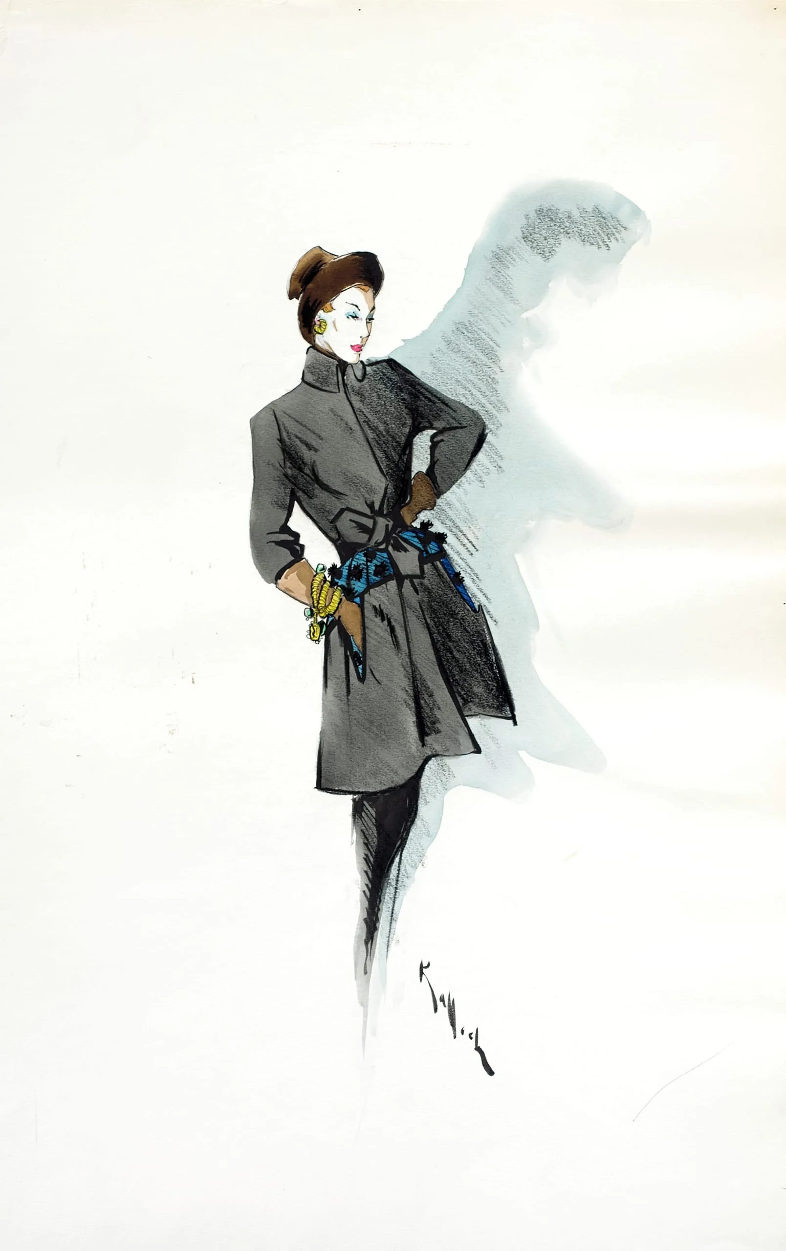 Fashion illustration in pencil, charcoal, and watercolor on cream paper, full-length female figure in a belted gray coat shown from behind, with loose gestural lines and pale blue wash