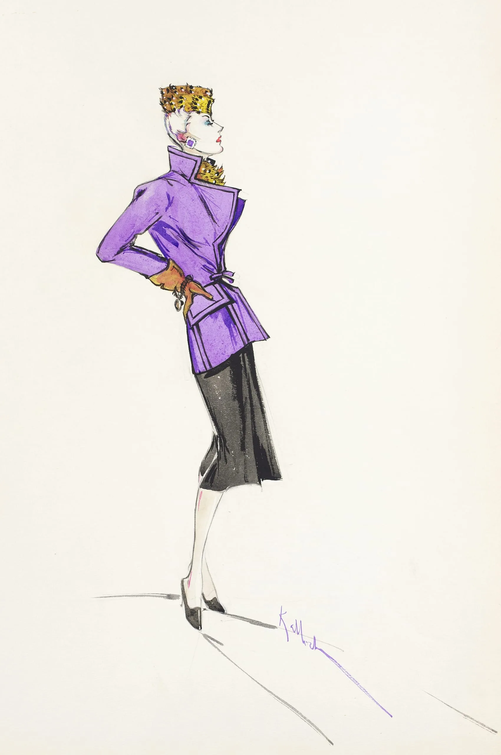 Fashion illustration in ink and color wash on white paper, showing a woman in profile wearing a violet structured jacket, black skirt, and jeweled crown hat