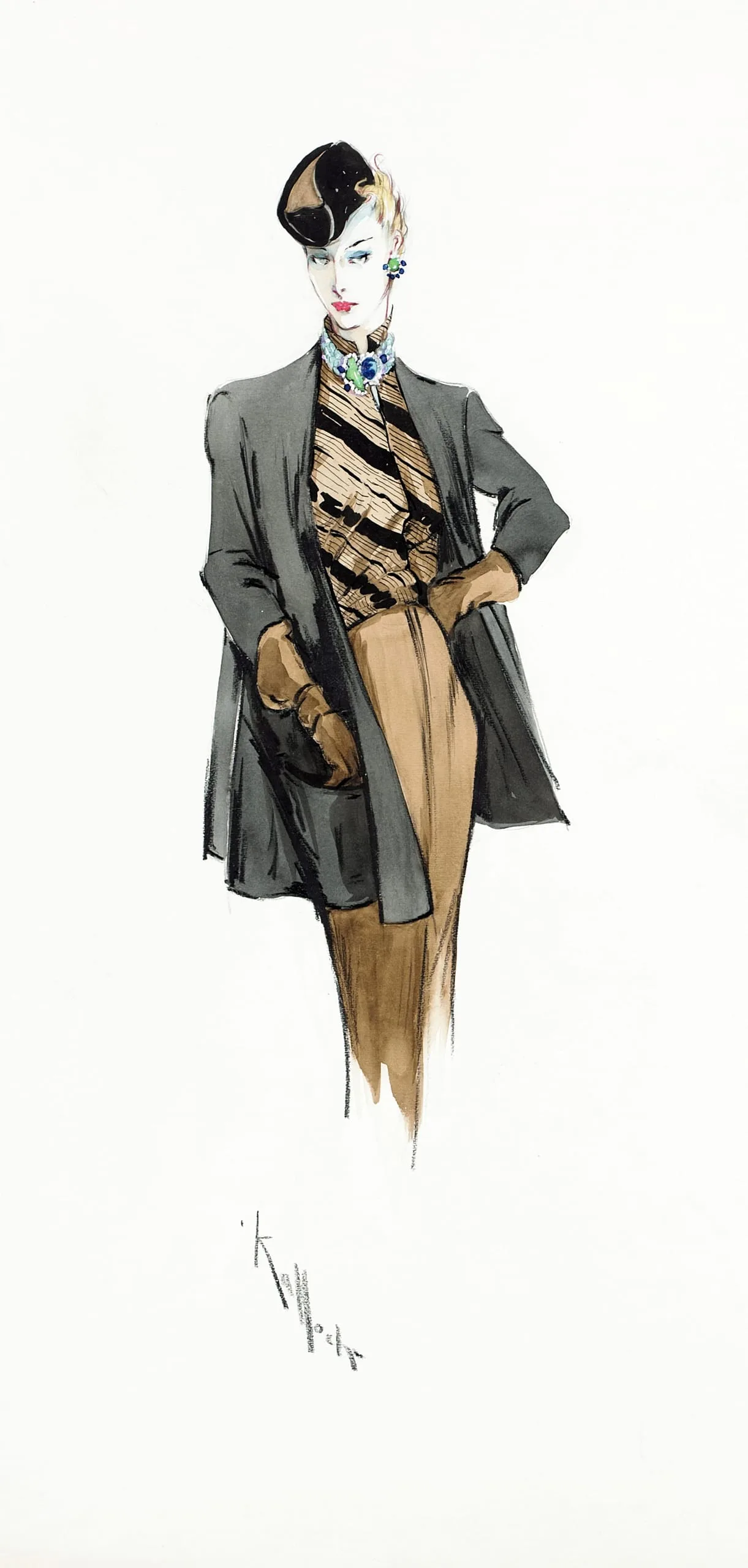 Fashion illustration in ink and watercolor of a standing female figure wearing a charcoal jacket, striped top, and tan skirt with a sculptural black hat and jeweled necklace