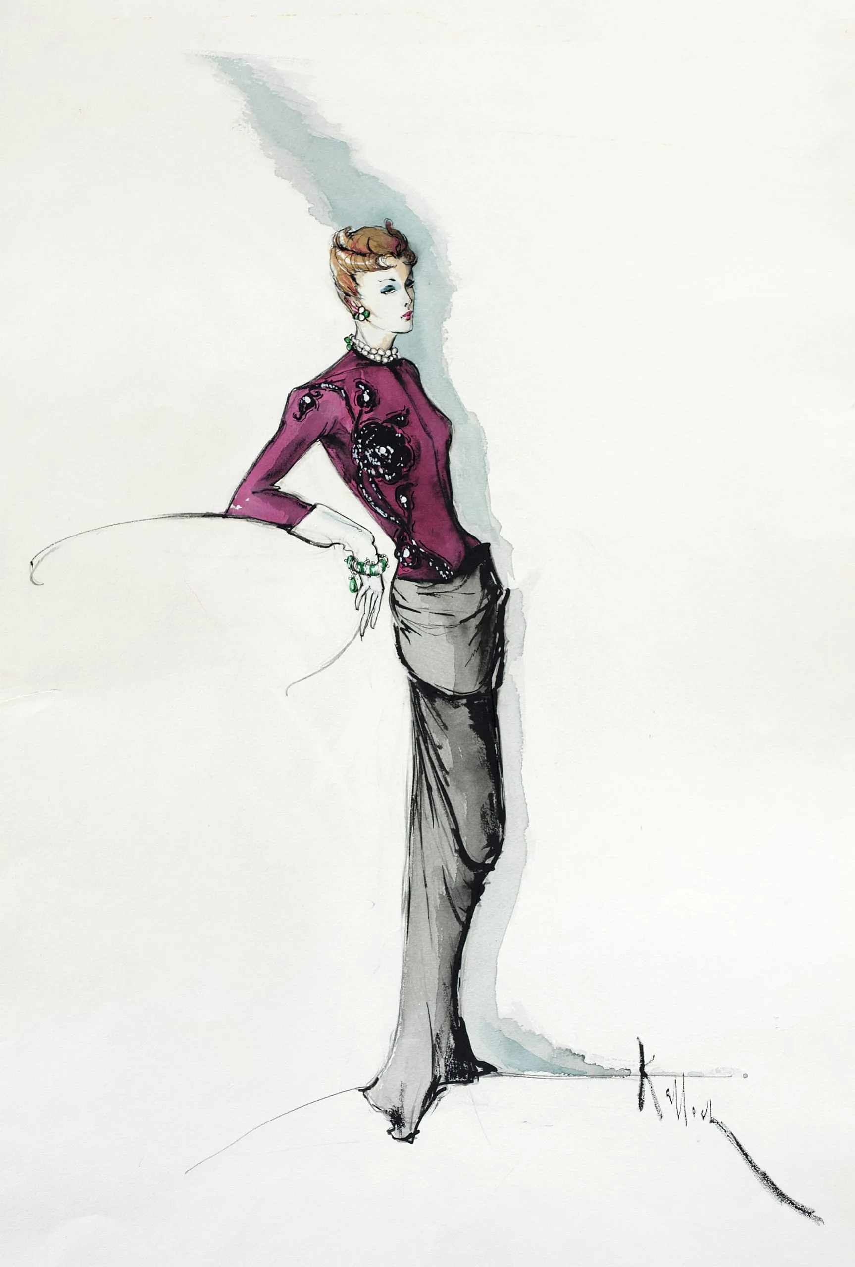 Fashion illustration in ink and watercolor, full-length woman in profile wearing a magenta beaded top and gray draped skirt, with green bracelet and pearl necklace