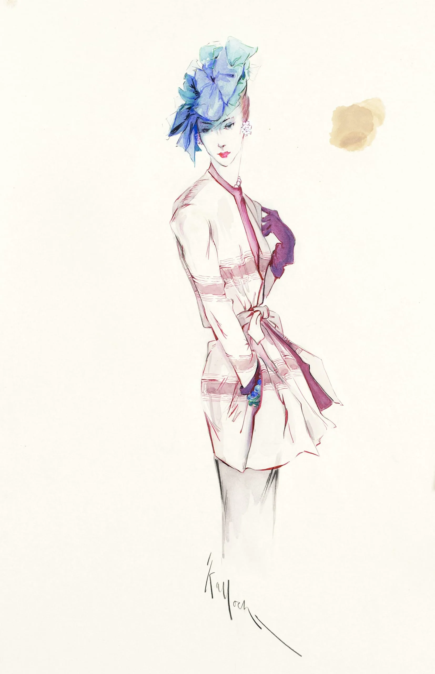 Fashion illustration in pencil and watercolor of a female figure in a rose-pink structured jacket and skirt, wearing a large cobalt blue floral hat and violet gloves