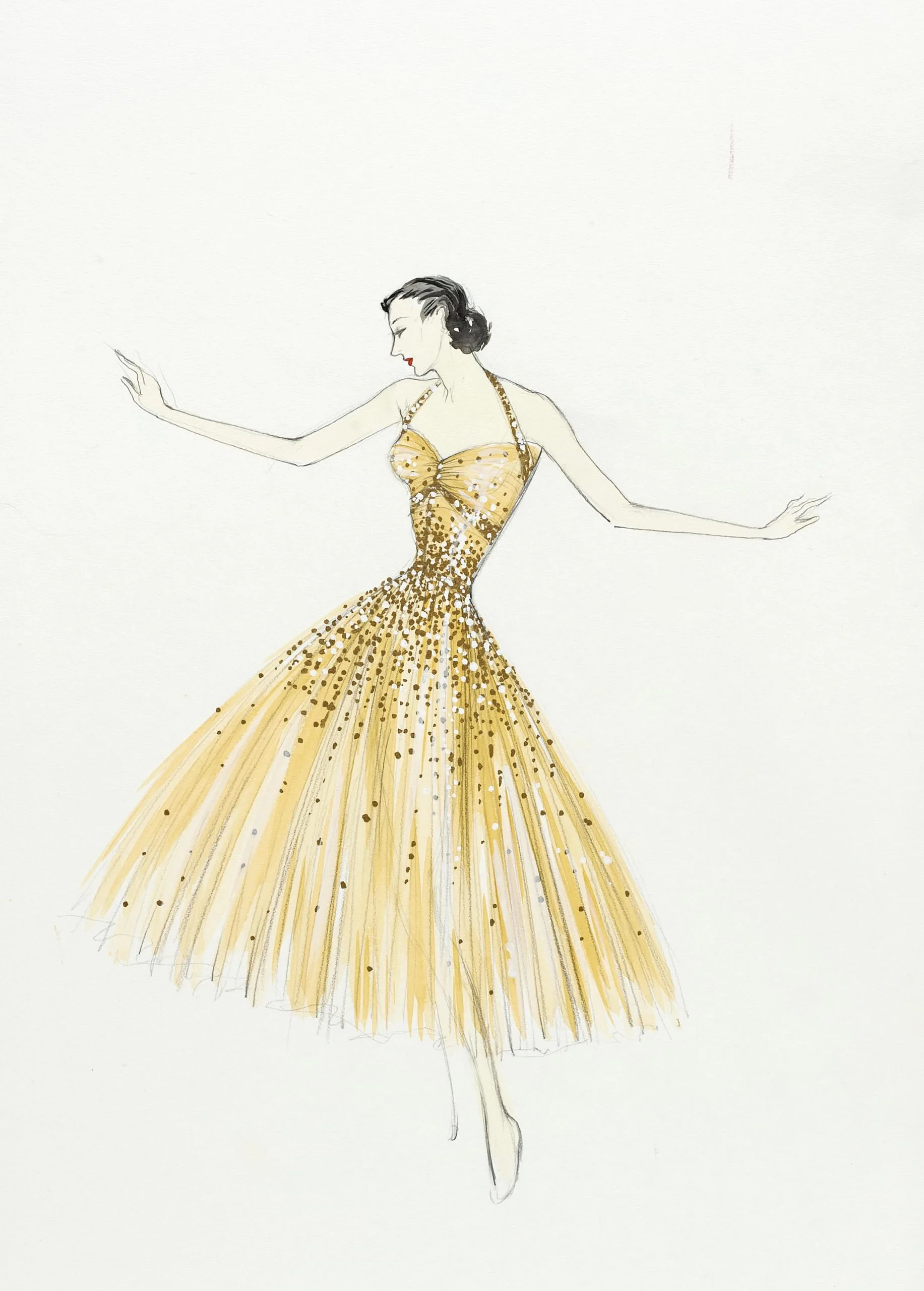 Fashion illustration in ink and watercolor, a woman in profile in a honey-gold beaded halter gown with a full, pleated skirt, arms extended, standing on one foot