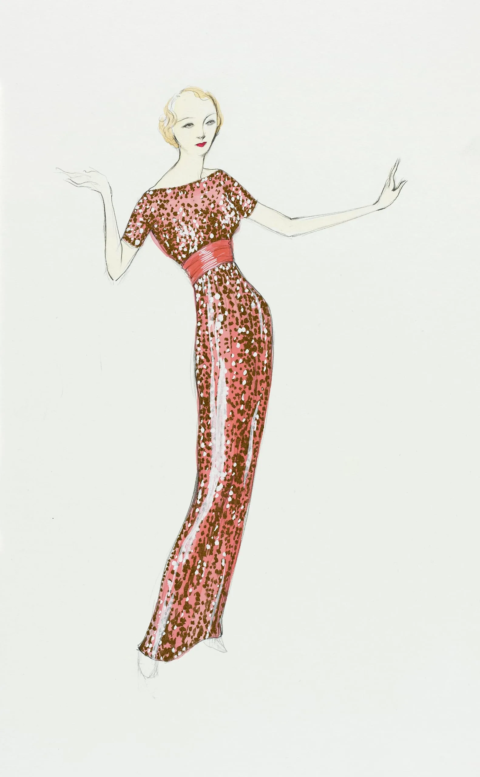 Fashion illustration in ink and gouache of a full-length female figure in a floor-length coral and brown spotted evening gown with a wide satin waistband, arms raised in a posed stance