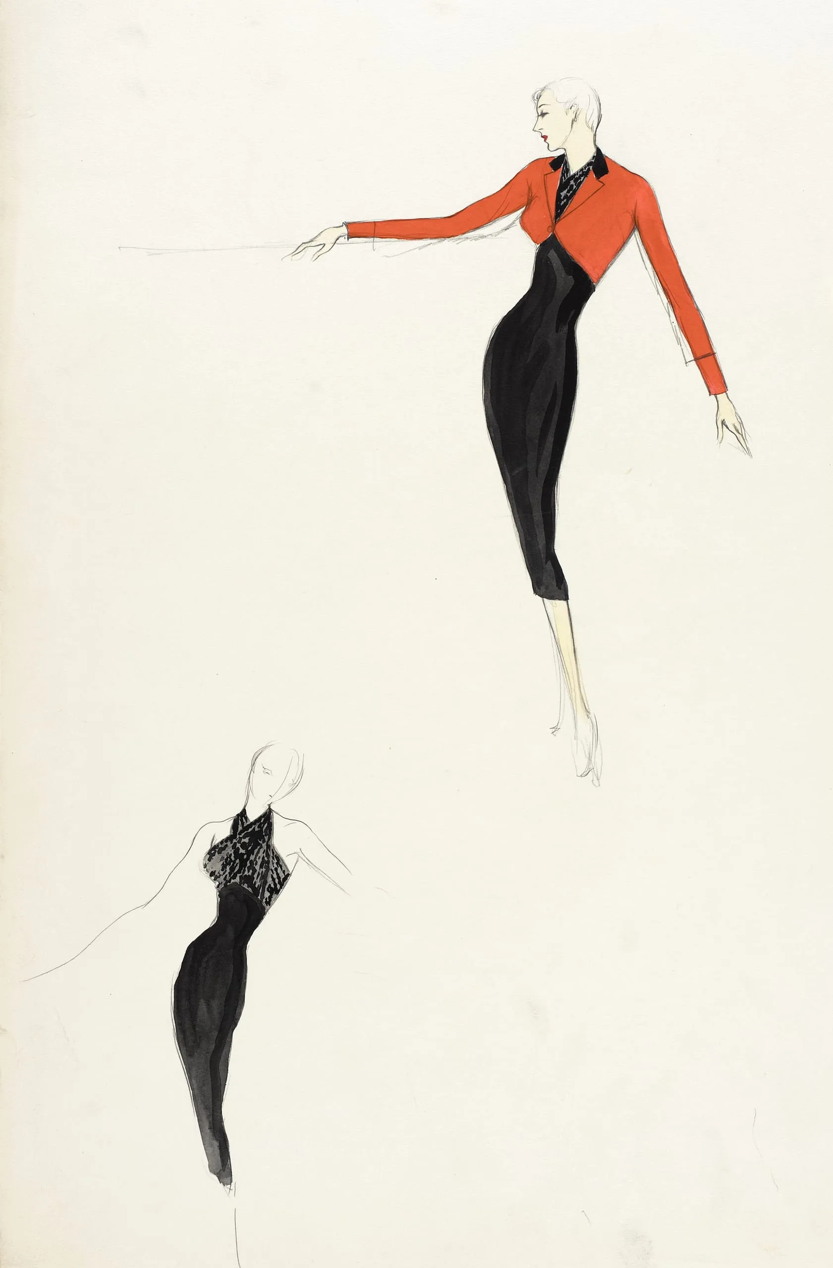 Fashion illustration drawing on cream paper, two figures in black form-fitting outfits, the larger wearing a coral-red cropped jacket, rendered in ink and watercolor