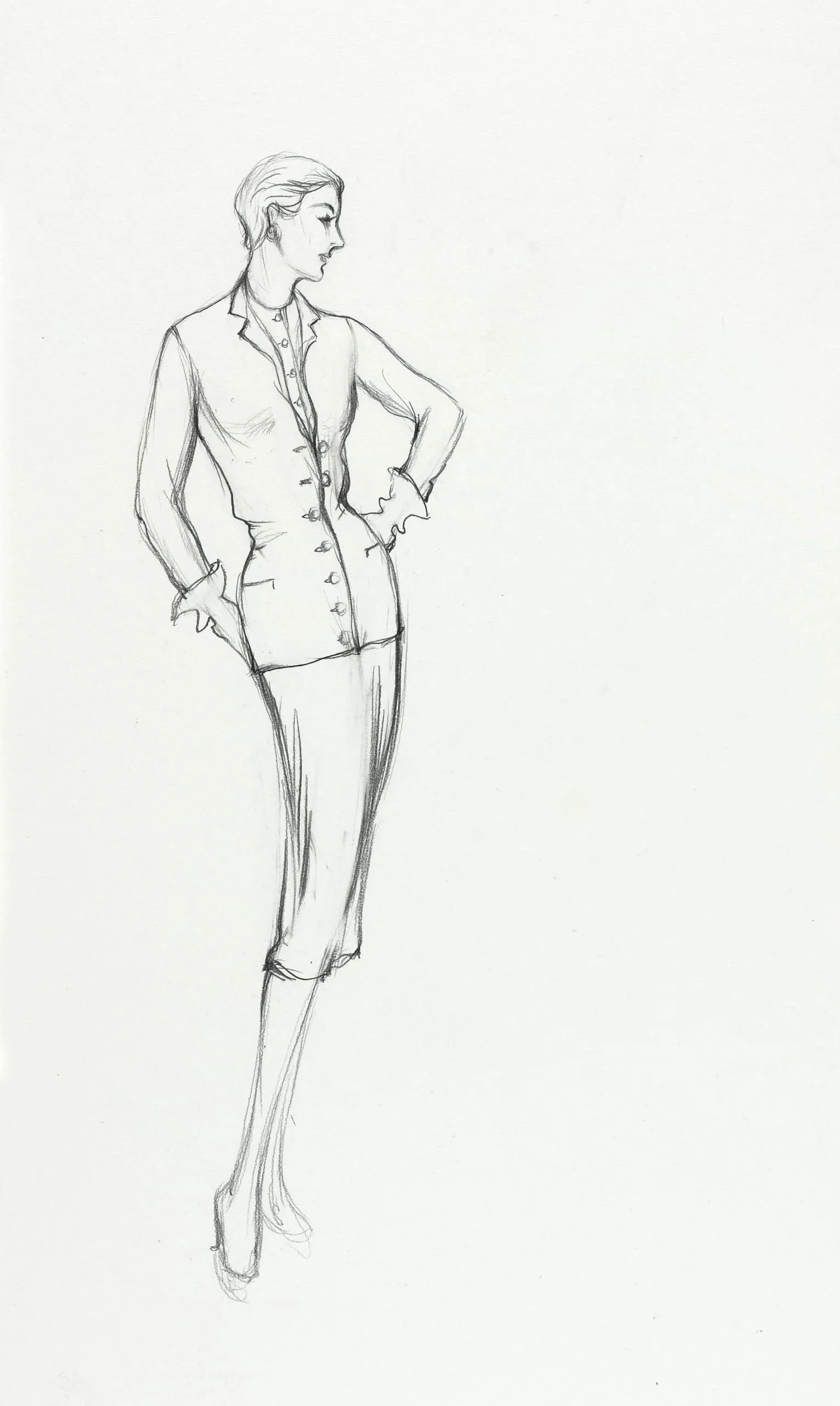 Pencil fashion illustration on white paper, full-length female figure in profile wearing a fitted button-front jacket and narrow knee-length skirt, hands on hips