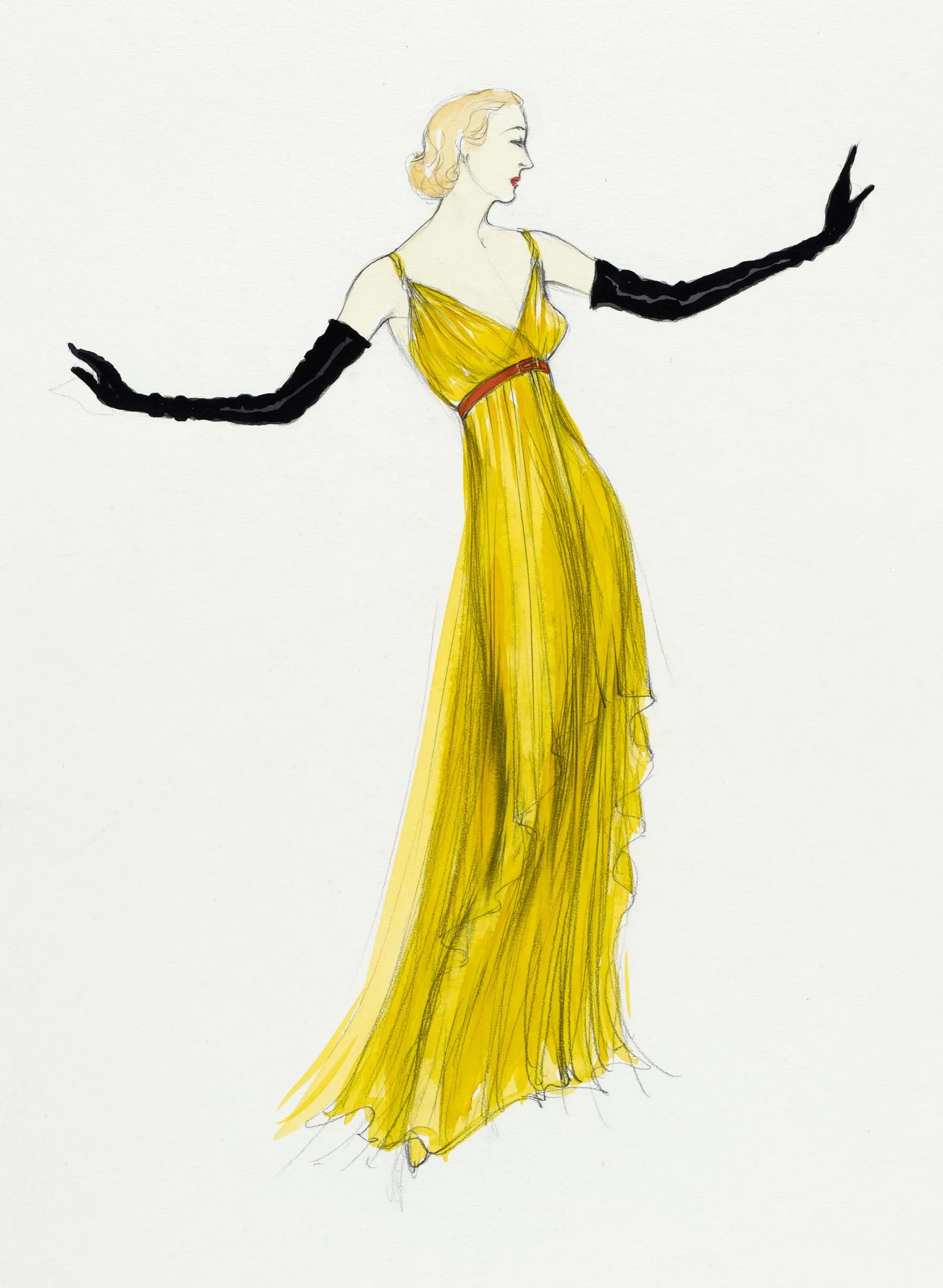 Fashion illustration in ink and watercolor of a woman in profile wearing a floor-length chartreuse yellow gown and long black gloves, arms extended, on white paper