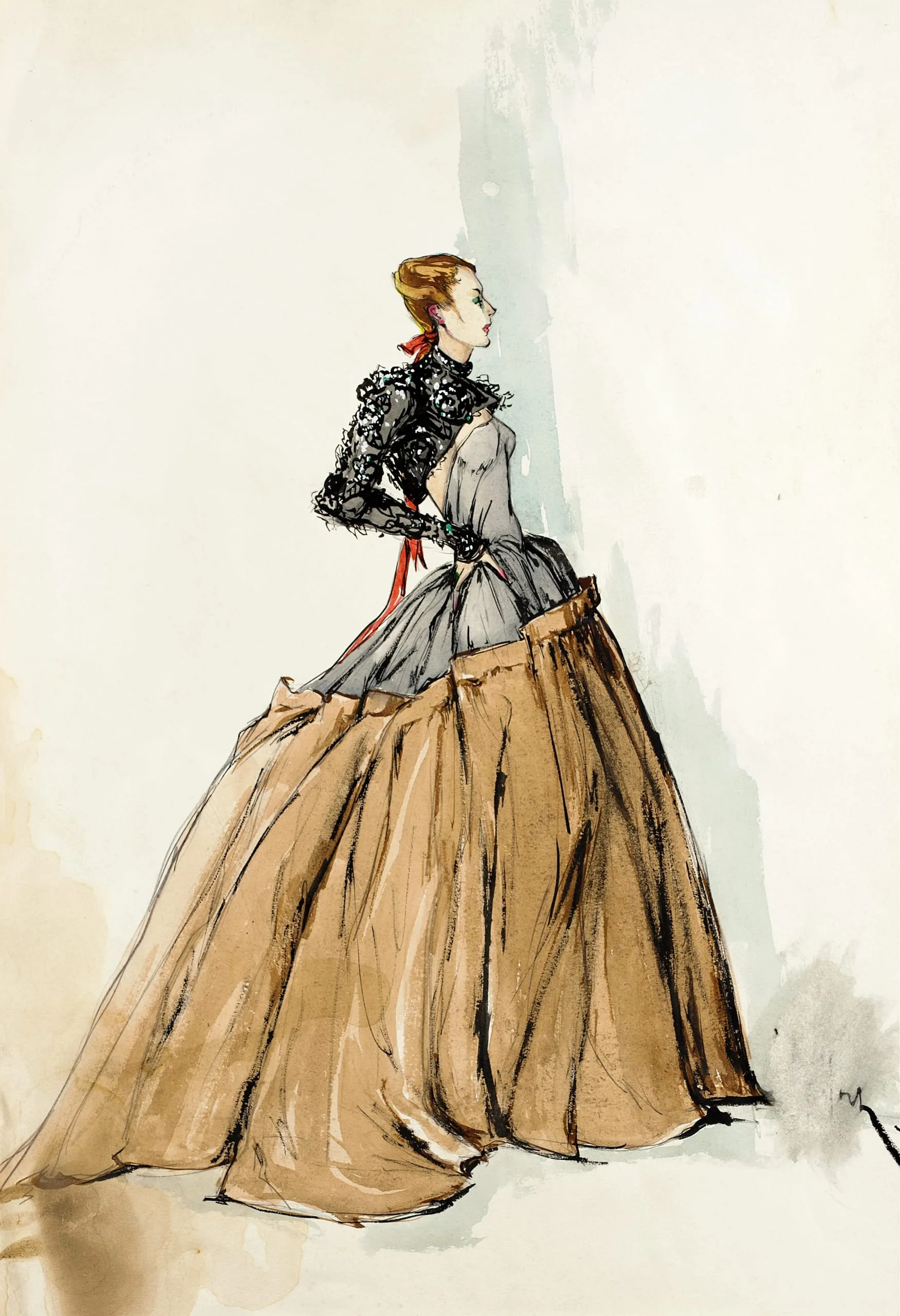 Ink and watercolor costume sketch of a woman in profile wearing a voluminous tan ballgown with a black lace bodice and red ribbon sash, on cream paper