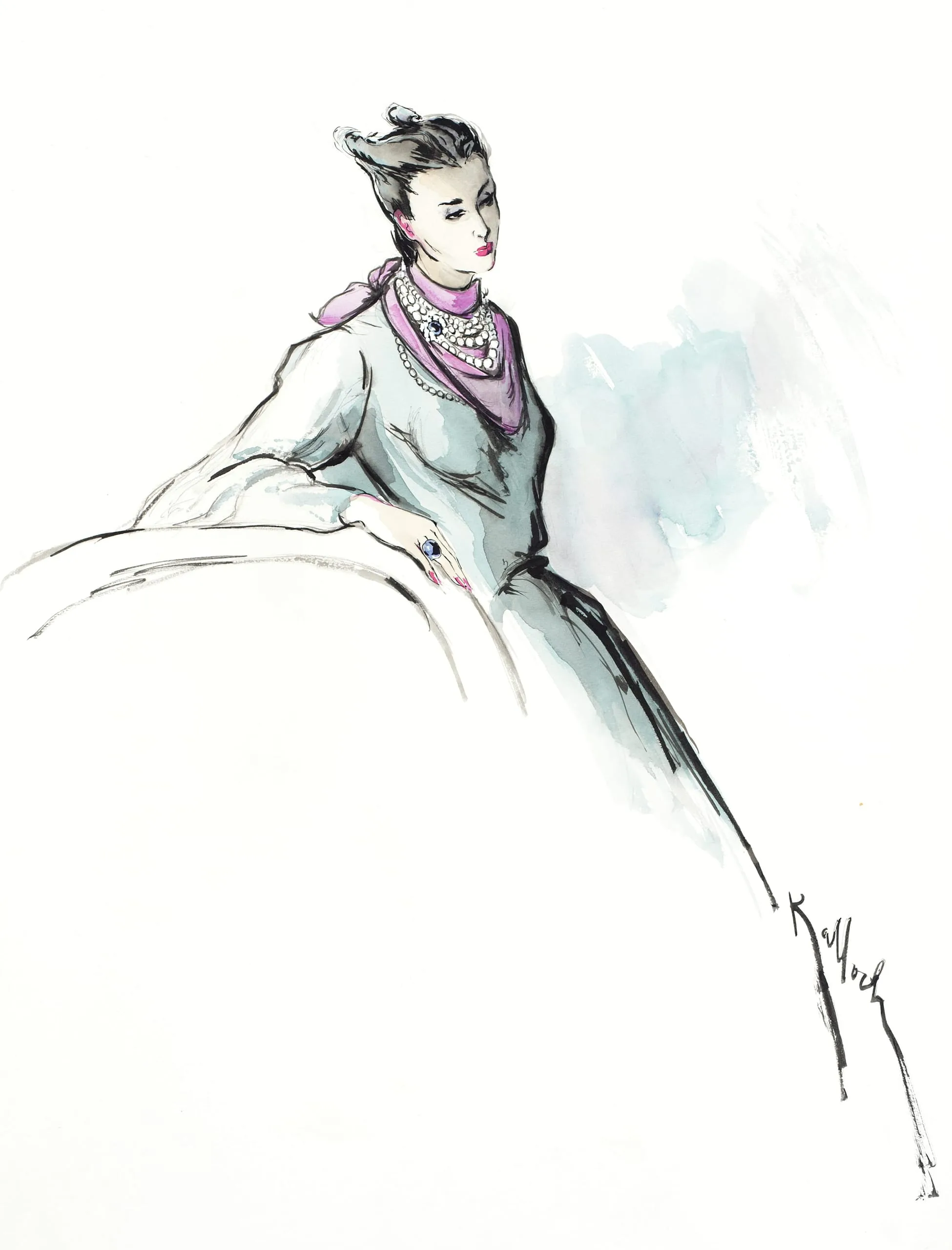 Fashion illustration in black ink and blue-gray watercolor wash, a woman in profile leaning forward in a belted gray garment with pearl necklaces and violet scarf