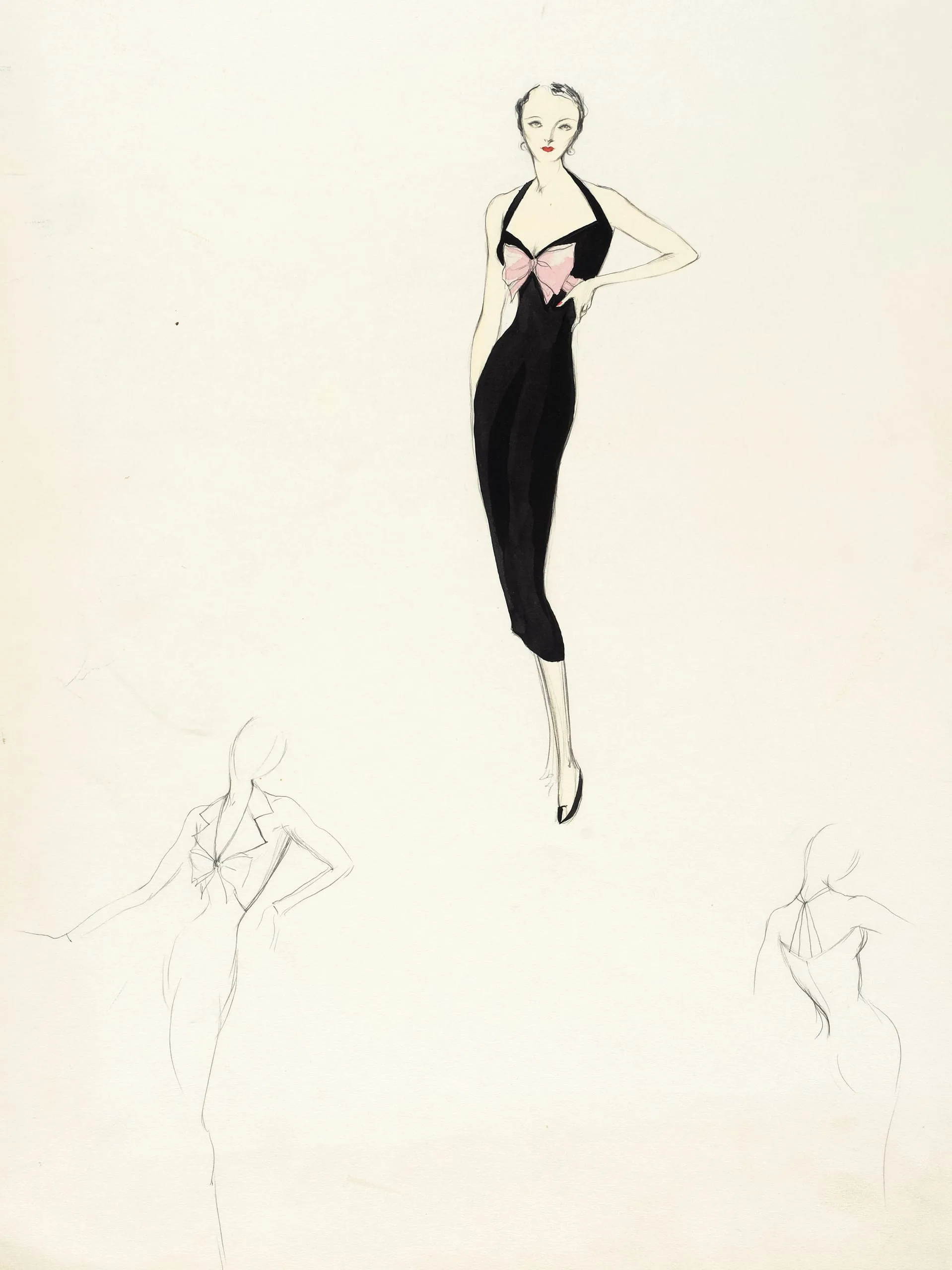 Fashion drawing in black ink and wash on cream paper, one fully rendered figure in a black halter midi dress with a pink bow, flanked by two loose pencil sketches showing the back view