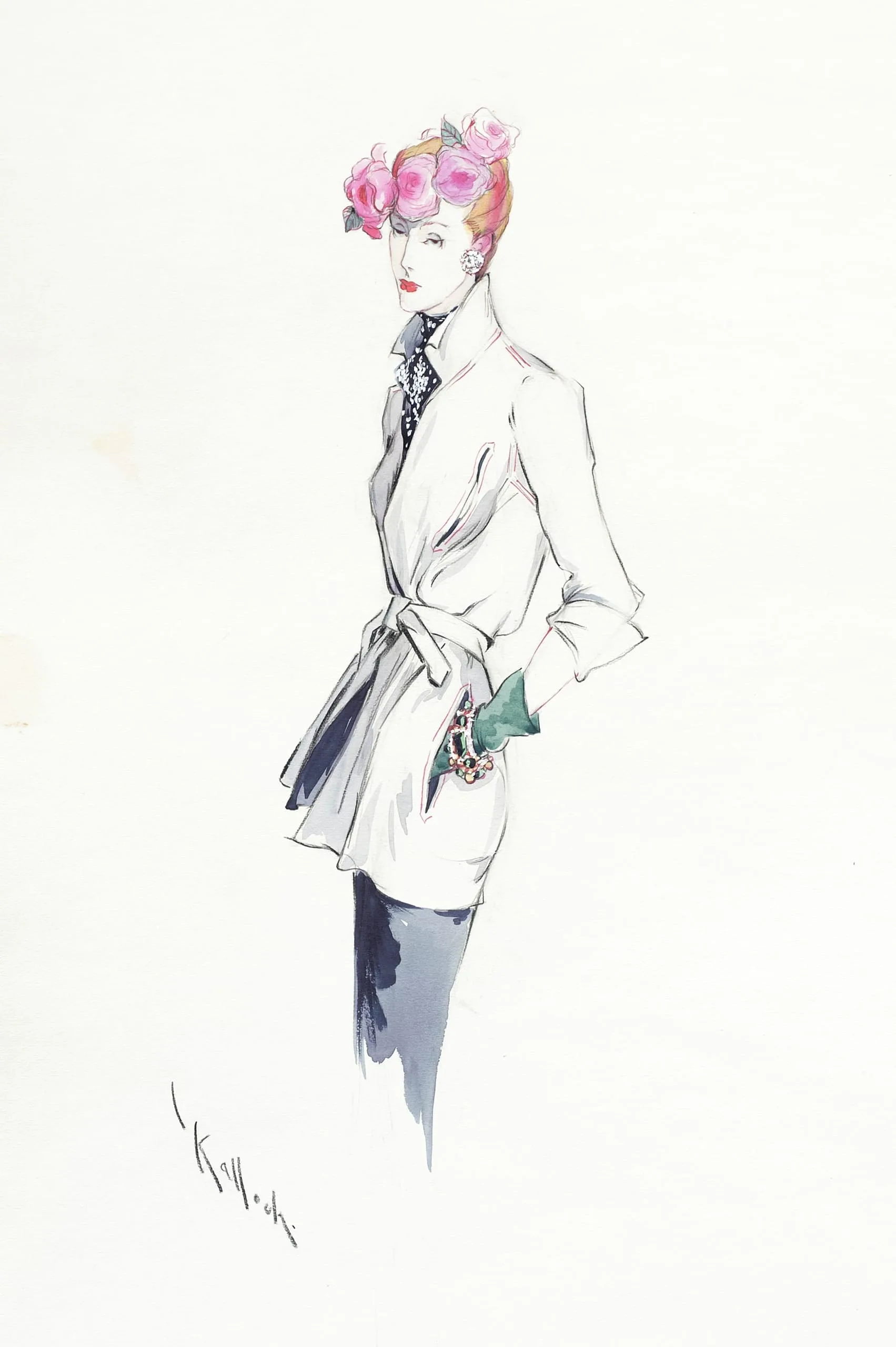 Fashion illustration in ink and watercolor on cream paper, full-length female figure in a belted white jacket and pink rose hat, turned to look over her shoulder