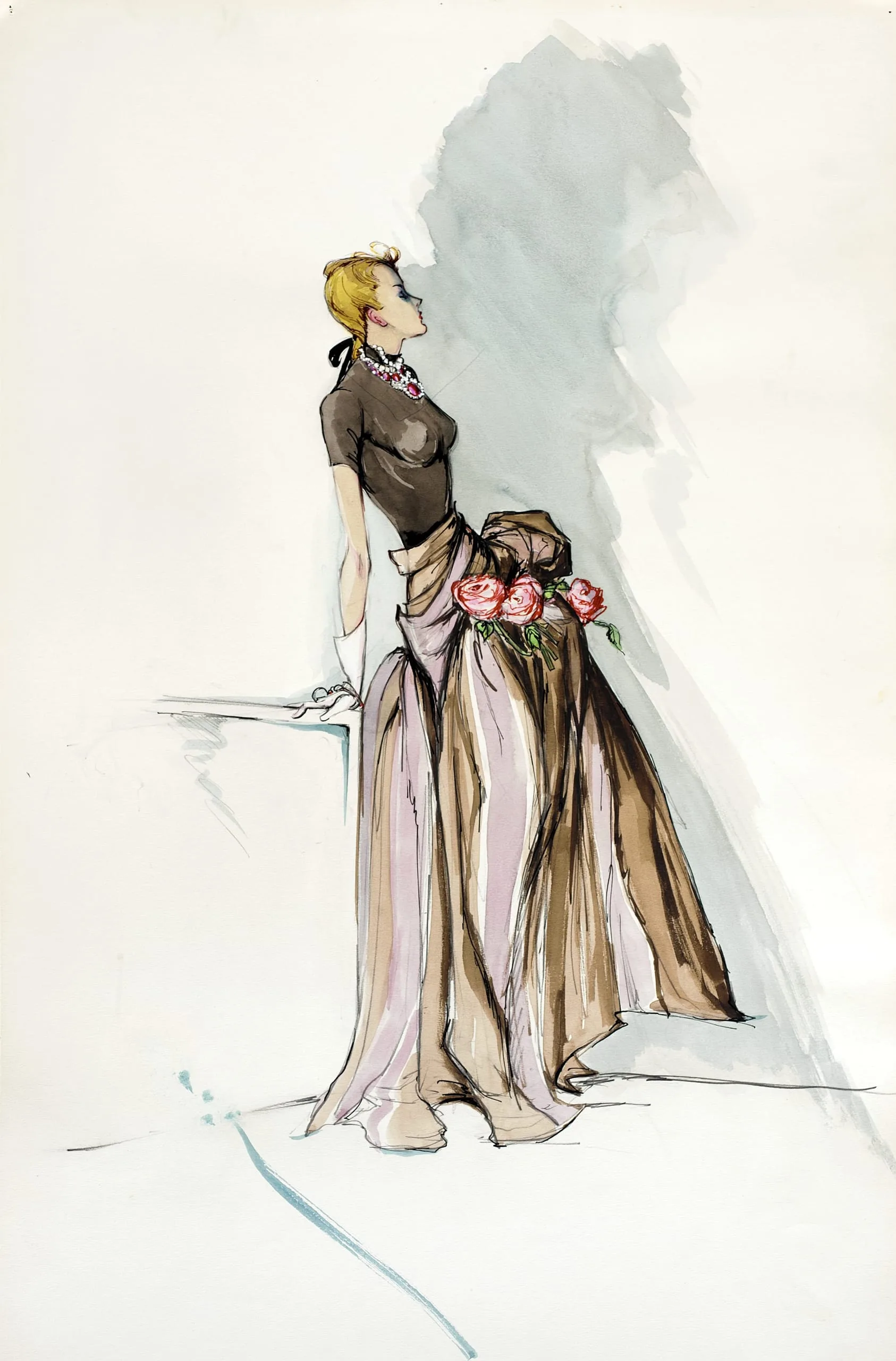 Watercolor and ink fashion illustration of a woman in profile, wearing a fitted dark top and a full, layered pink and brown skirt with roses at the waist