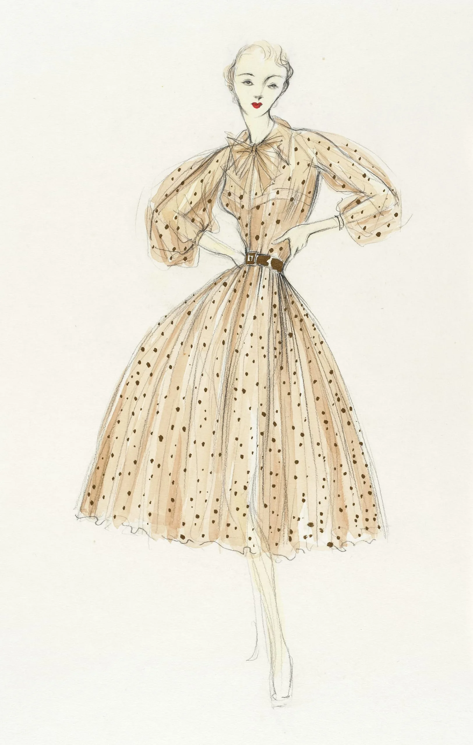 Fashion illustration in ink and watercolor, full-length figure in a sand-colored polka-dot dress with full skirt, cinched waist, and voluminous sleeves